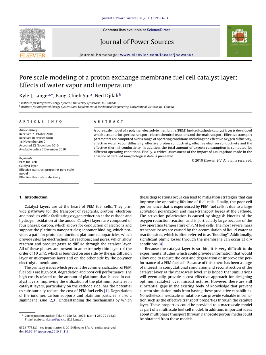 摘要:开发聚合物电解质膜(PEM)燃料电池阴极催化剂层的孔隙模型,其中包括物质运输,电化学反应和热传输。有效的传输参数是在一系列操作条件下计算的,包括有效氧扩散系数,有效水蒸气扩散系数,有效质子传导率,有效电子导电率和有效导热系数。此外,针对不同的操作条件计算总耗氧量。最后,提出了在没有详细形态学数据的情况下对假设的影响进行的关键评估。