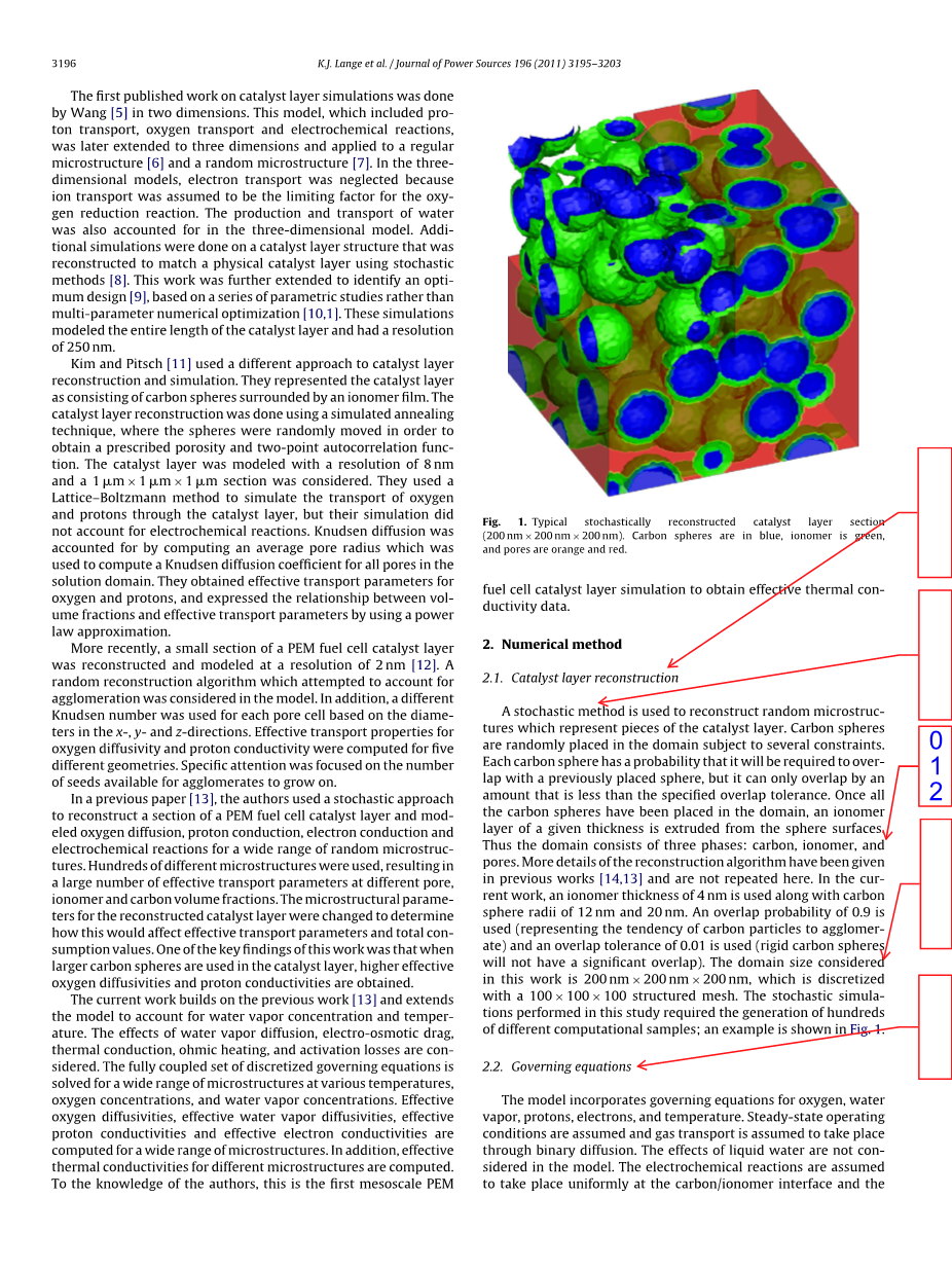 第一篇关于催化剂层模拟的论文由Wang[5]在二维中完成。该模型包括质子传输,氧传输和电化学反应,后来扩展到三维,并应用于规则的微观结构[6]和随机微观结构[7]。在三维模型中,电子传输被忽略,因为假设离子传输是氧还原反应的限制因素。在三维模型中也考虑了水的生产和运输。对催化剂层结构进行了额外的模拟,该结构使用随机方法重建以匹配物理催化剂层[8]。基于一系列参数研究而不是多参数数值优化[10,1],这项工作进一步扩展,直到确定最佳设计[9]。这些模拟实验模拟了催化剂层的整个长度,并具有250nm的分辨率。