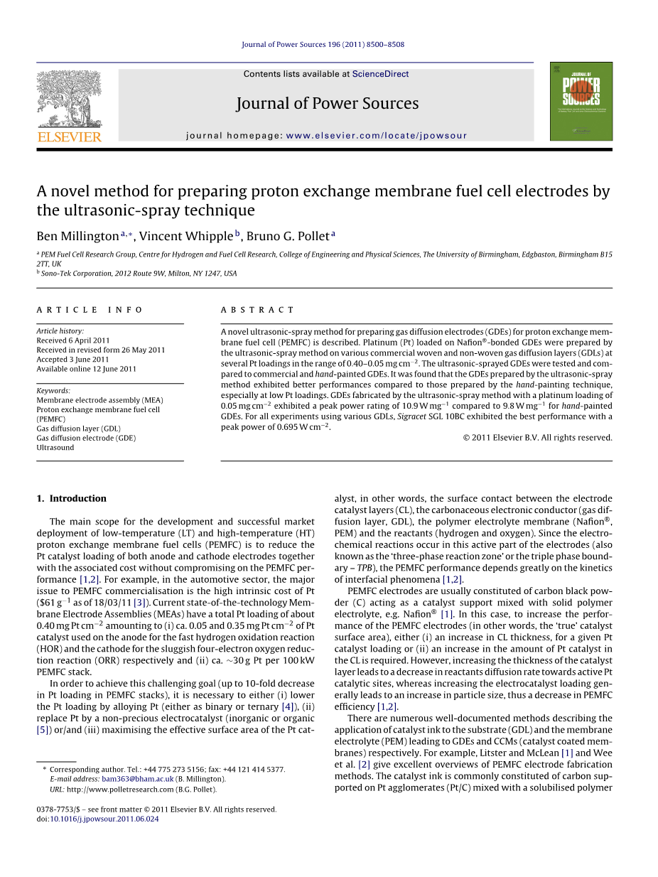 减少TPB中化学污染和无活性Pt的许多方法之一是采用超声形式的有效搅拌或强制对流。最近,Pollet回顾[6]并发表了[7],[8]超声波可用于制造贵金属和催化剂以及制备燃料电池材料的报告。Pollet[6]在他的全面综述中表明,超声波,声化学和声电化学方法可用于制备有效的单金属和双金属纳米粒子。,碳负载的电催化剂,燃料电池电极和膜具有优于许多其他方法的优点是由于所造成的不寻常的实验条件下的空化,水超声波分解和增强质量传递现象[6],[7],[8]。
