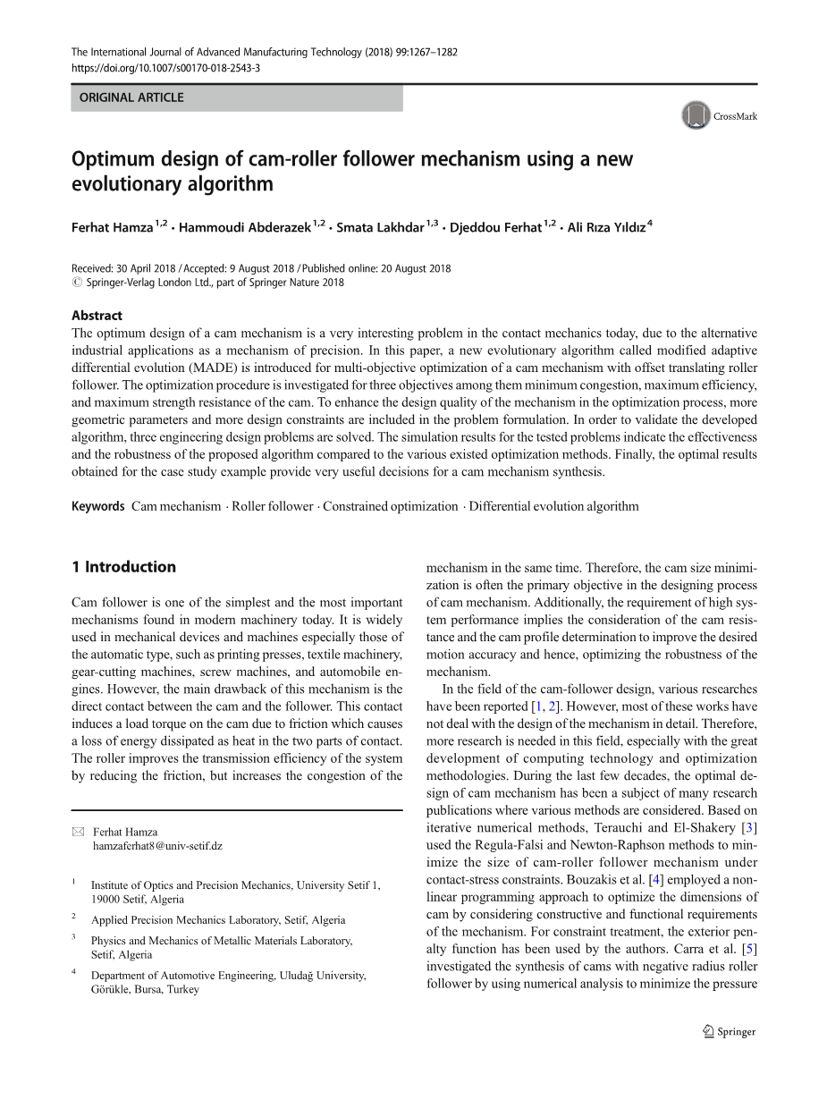 摘要:如今,凸轮机构作为一精密机构的替代品在工业上被广泛应用,这使得其优化设计成为接触力学中一个非常热门的问题。本文提出了一种改进的自适应差分进化算法(MADE),用于偏置平移滚子从动式凸轮机构的多目标优化。并以优化凸轮的最小阻力、最大效率和最大强度阻力为目标,研究了优化过程。在优化过程中,为提高机构的设计质量,更多的几何参数和更多的设计约束包含在问题模型中。为了验证所提出的算法,还利用其去解决三个工程设计问题。这些问题的仿真结果表明:与现有的各种优化方法相比,该算法具有有效性和鲁棒性。最后,通过算例得到的优化结果为凸轮机构总成提供了非常有用的决策依据。