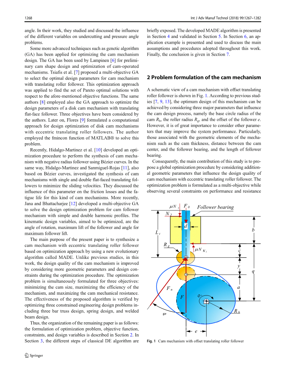 最近,Hidalgo-Martinez等人开发一种优化程序,以研究型线基于贝塞尔曲线建立的负半径滚子从动件凸轮机构。同样地,Hidalgo-Martinez和Sanmiguel-Rojas也基于贝塞尔曲线,以最小化滑动速度为目标,研究了带单平面和双平面平移从动件凸轮机构的合成。他们论述了该参数对这类凸轮机构的摩擦损失和疲劳寿命的影响。 最近,Jana和Bhattacharjee开发了一种多目标遗传算法,用来解决具有简谐和双谐波轮廓的凸轮机构的设计优化问题。他们旨在优化旋转角度,从动件最大推力和及其对应的角度这些运动学变量。