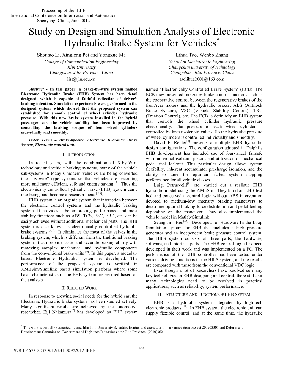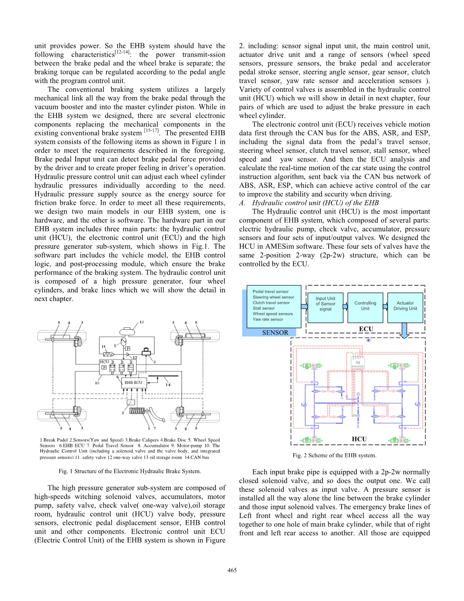为适应社会对混合动力汽车日益增长的需求,对电子液压制动系统进行了积极的研究。汽车研究人员取得了许多重要的成果。中村英二[7]开发了EHB系统命名为“电控制动系统”(ECB)。他们提出的ECB集成了制动控制功能,如前/后发动机再生制动与液压制动之间的合作控制,ABS(防抱死制动系统),VSC(车辆稳定性控制),TRC(牵引力控制)等。ECB是一个EHB系统,控制轮缸液压电子压力。各轮缸的压力由线性电磁阀控制。因此,液压缸的液压控制是独立和平稳的。