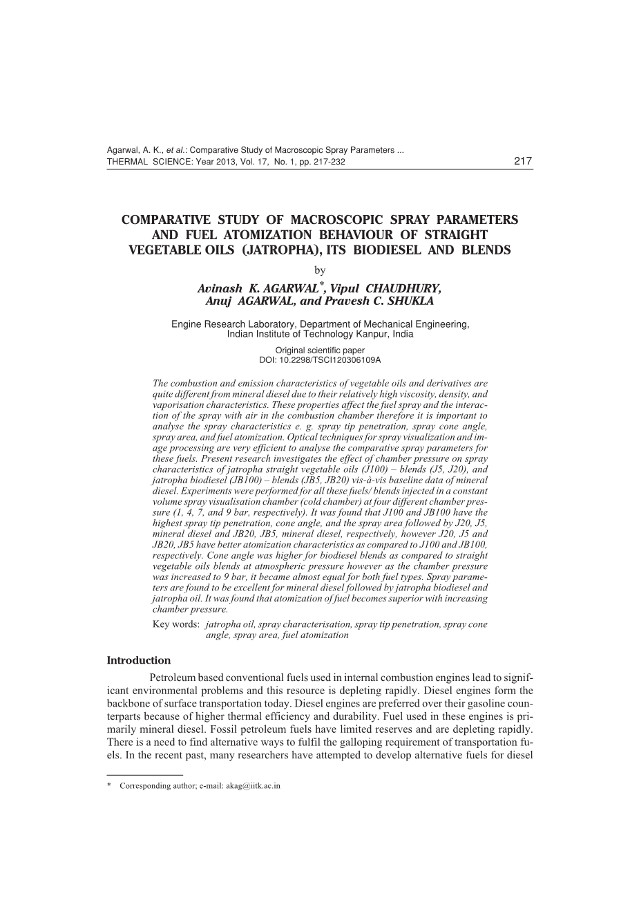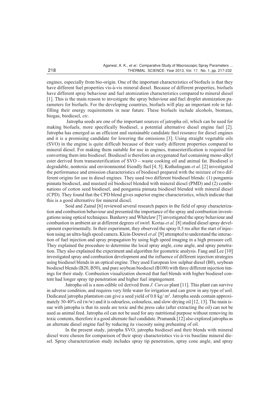 Key words: jatropha oil; spray characterisation; spray tip penetration; spray cone angle; spray area; fuel atomization