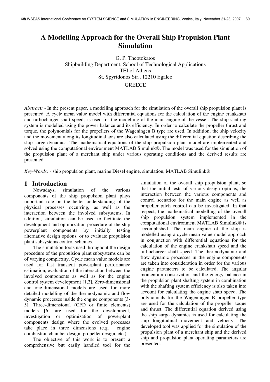 这项工作的目的是提出一个全面的,并且易于处理的工具对整个船舶推进装置进行仿真,以便对各种设计方案进行初步试验,研究各部件与主机控制方案之间的相互作用以及螺旋桨螺距控制。在此基础上,完成了在MATLAB Simulinkreg;计算环境下实现的船舶整体推进系统的数学建模。采用循环均值模型方法,结合微分方程对船舶主发动机曲轴转速和增压器轴转速进行了建模。为了计算各种发动机参数,考虑了发动机部件的热力学和流动动力学过程。在计算发动机轴转速时,还考虑了推进装置轴系的角动量守恒和能量平衡以及轴系的效率。利用瓦赫宁根B型螺旋桨的多项式计算螺旋桨的转矩和推力。利用船舶纵摇动力学导出的微分方程,计算了船舶纵向运动和速度。将所研制的仿真工具应用于某商船推进装置的仿真,给出了船舶和推进装置的运行参数。