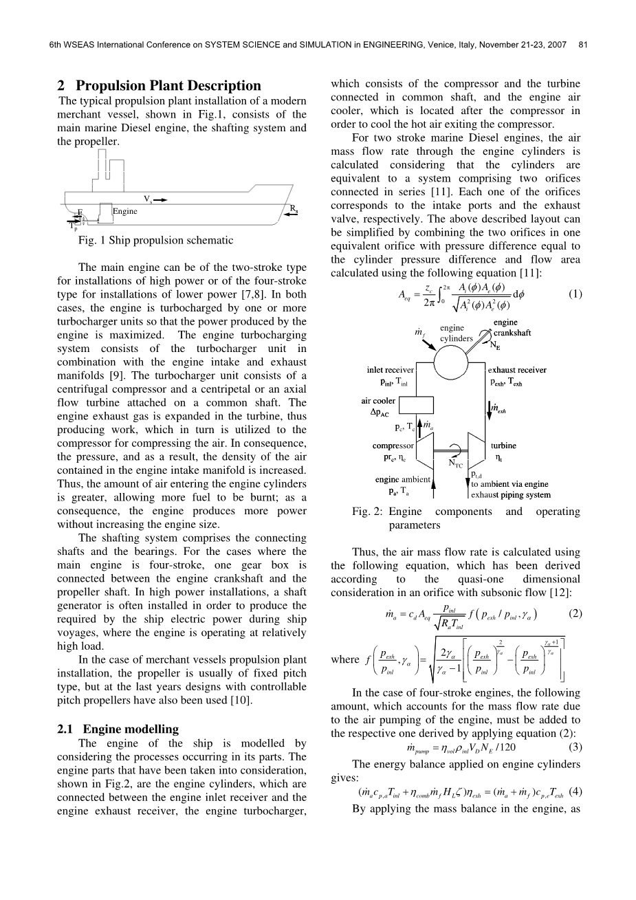 该船的发动机是通过考虑在其部件中进行的过程来建模的。所考虑的发动机部件,图2所示,是发动机气缸,位于发动机进气和发动机排气之间,发动机涡轮增压器,由压缩机和涡轮机连接轴组成,而发动机空气冷却器,位于压缩机内对空气进行冷却并排出。
