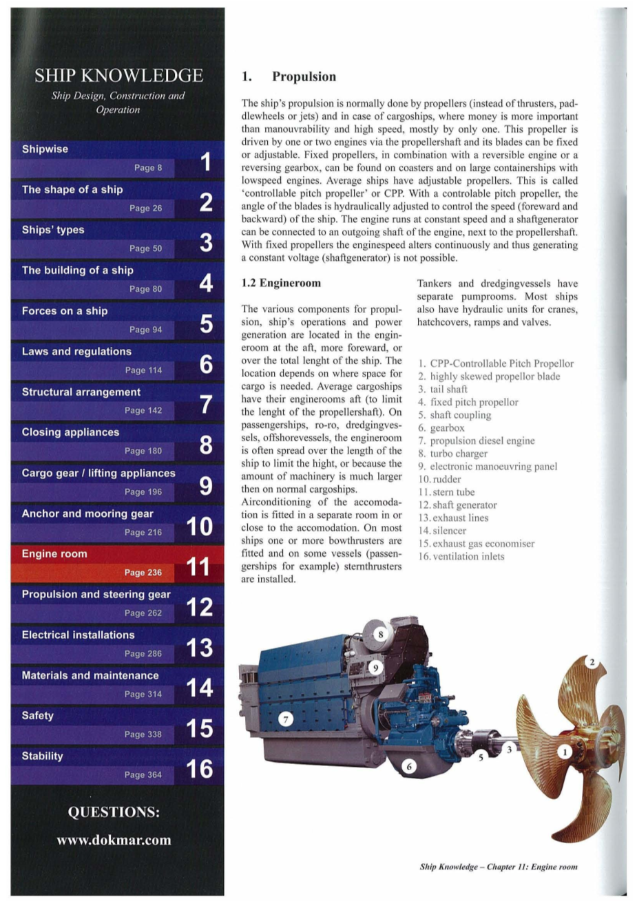 The ship#39;s propulsion is normally done by propellers (instead of thrusters, paddlewheels or jets) and in case of cargo ships ,where money is more important than maneuverability and high speed, mostly by only one. This propeller is driven by one or two engines via the propeller shaft and its blades can be fixed or adjustable. Fixed propellers, in combination with a reversible engine or a reversing gearbox, can be found on coasters and on large containerships with low speed engines. Average ships have adjustable propellers. This is called #39;controllable pitch propeller#39; or CPP. With a controllable pitch propeller, the angle of the blades is hydraulically adjusted to control the speed (fore ward and backward) of the ship. The engine runs at constant speed and a shaft generator can be connected to an outgoing shaft of the engine, next to the shaft. With propeller fixed propellers the engine speed alters continuously and thus generating a constant voltage (shaft generator) is not possible.