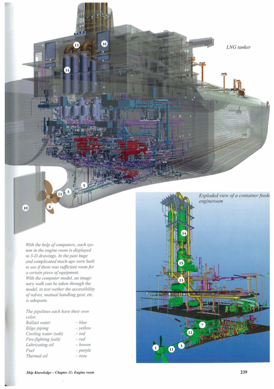 所有发动机室至少包括:主机(推进)、辅助发动机(发电)、冷却水系统、润滑油系统、燃油系统、压缩空气系统(启动、控制和工作空气)、饮用水系统、污水系统、舱底系统、压载系统、锅炉(油箱加热、宿舍使用等)、制冷系统、消防系统、润滑油储罐、液压油、燃油、导热油、备件库、控制室和车间。