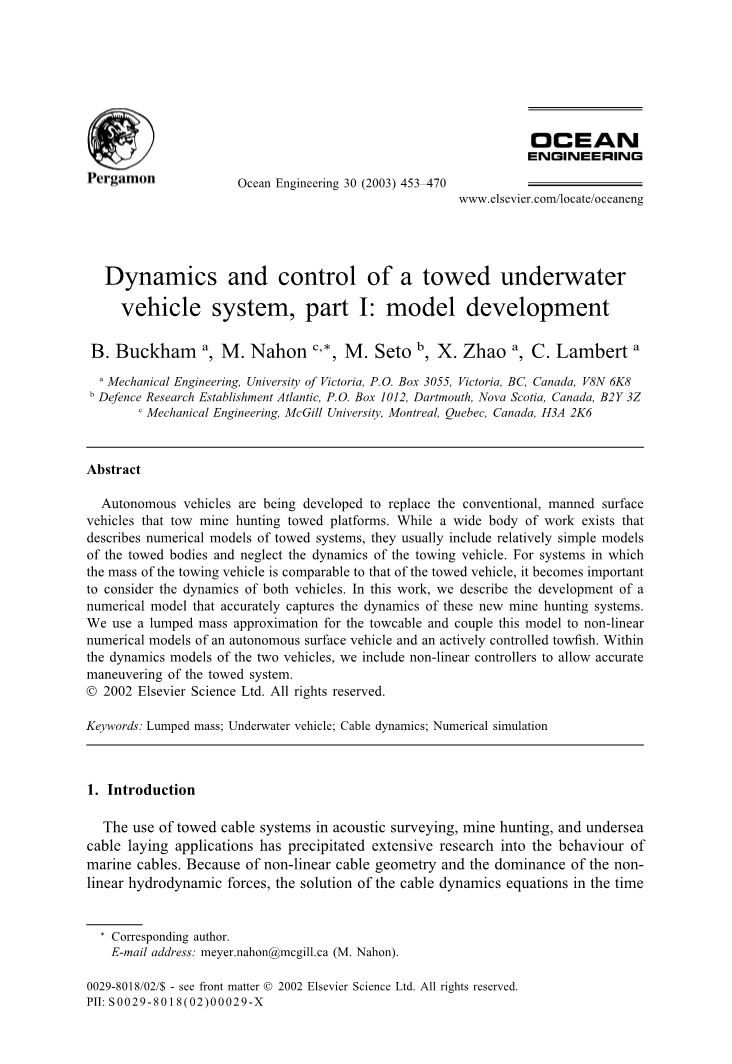 B. Buckham a, M. Nahon c,* , M. Seto b, X. Zhao a, C. Lambert a