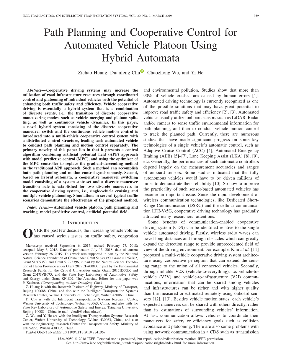 在过去的几十年中,车辆数量的增加已经对交通安全、拥堵和环境污染造成严重问题。研究表明,超过90%的车辆碰撞是由人为错误引起的[1]。自动驾驶技术目前被认为是可能具有改善道路交通安全性和效率的可能解决方案之一[2],[3]。自动车辆通常利用诸如LiDAR,雷达和摄像机之类的车载传感器来感测用于路径规划的交通环境信息,然后进行车辆运动控制以跟踪计划的路径。目前,有许多研究在单车辆自动控制的一些关键技术上取得了重大进展,例如自适应巡航控制(ACC)[4],自动紧急制动(AEB)[5]-[7],车道保持辅助(LKA)[8],[9]等。通常,这种自动控制器的性能在很大程度上取决于测量精度和车载传感器的范围。一些研究表明,完全自动驾驶的车辆必须被驱动数百万英里以证明其可靠性[10]。因此,如何提高这种基于传感器的自动车辆的实用性已成为一个重要问题。随着无线通信技术的快速发展,如专用短路通信(DSRC)和蜂窝通信LTE-V/5G,协同驱动技术逐渐引起了许多研究者的关注。