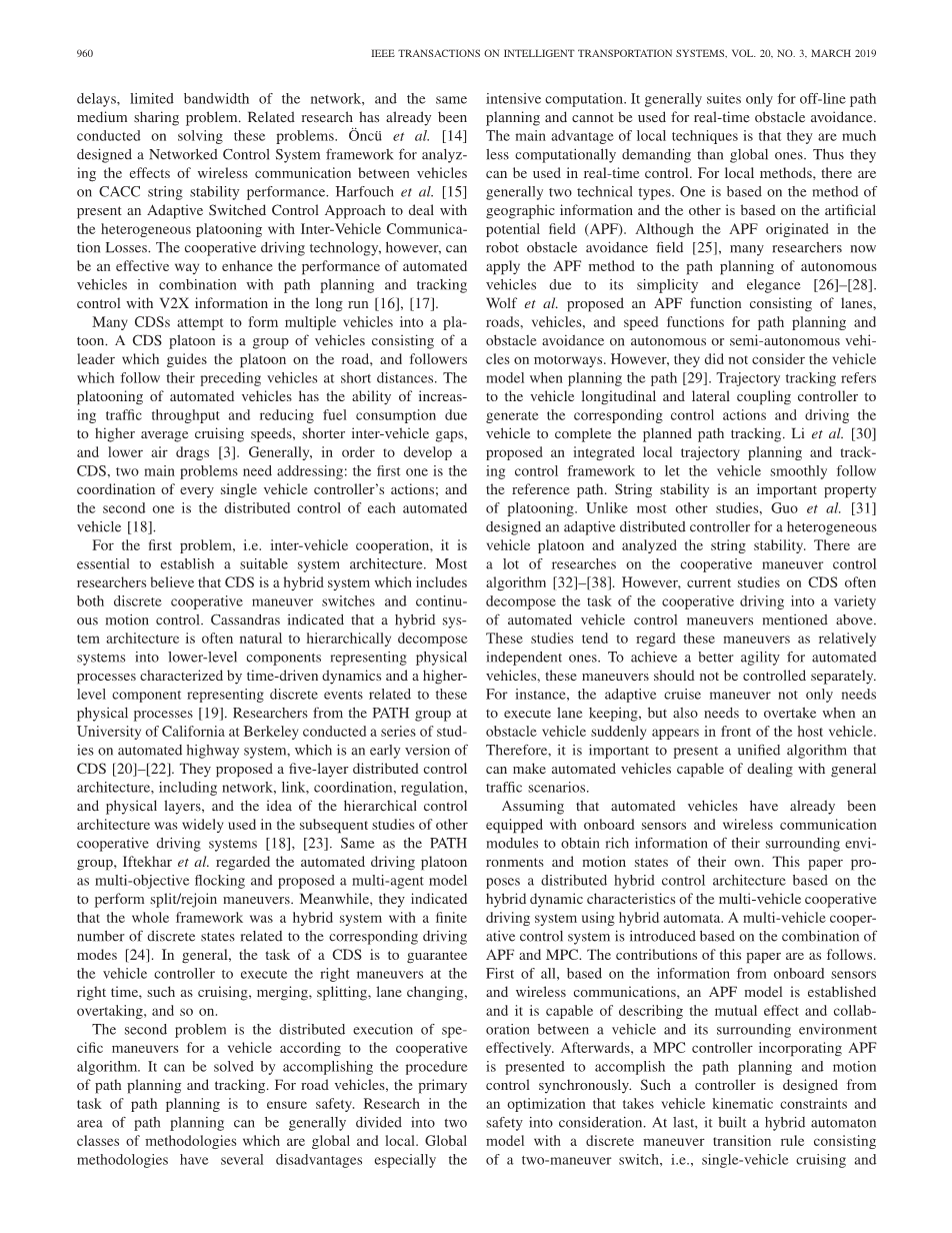 第二个问题是根据协同算法分布式执行车辆的特定操纵。它可以通过完成路径规划和跟踪的过程来解决。对于公路车辆,路径规划的主要任务是确保安全。路径规划领域的研究一般可分为两类全局和局部方法。全局方法有几个缺点,尤其是密集计算。它通常仅适用于离线路径规划,不能用于实时避障。局部方法的主要优点是它们的计算要求远低于全局方法。因此,它们可用于实时控制。对于局部路径规划,通常有两种技术类型。一种是基于地理信息的方法,另一种是基于人工势场(APF)。尽管APF起源于机器人避障领域[25],但由于其简洁和优雅,许多研究人员现在将APF方法应用于自动驾驶车辆的路径规划[26]-[28]。沃尔夫等人提出了APF功能,包括车道,道路,车辆和速度功能,用于高速公路上的自动或半自动车辆的路径规划和避障。但是,他们在规划路径时没有考虑车辆模型[29]。轨迹跟踪是指车辆纵向和横向耦合控制器,以产生相应的控制动作并驱动车辆完成计划的路径跟踪。李等人[30]提出了一个集成的局部轨迹规划和跟踪控制框架,以使车辆顺利地遵循参考路径。弦稳定性是队列的重要特征。与其他大多数研究不同,郭等人[31]为异构车队设计了一个自适应分布式控制器,并分析了弦的稳定性。关于协同机动控制算法有很多研究[32]-[38]。然而,目前关于CDS的研究经常将合作驾驶的任务分解为上述各种自动车辆控制操纵。这些研究倾向于将这些动作视为相对独立的动作。为了实现自动车辆更好的灵活性,不应单独控制这些操作。例如,自适应巡航机动不仅需要执行车道保持,而且当障碍车辆突然出现在主车辆前方时也需要超车。因此,提供一种统一的算法非常重要,该算法可以使自动车辆能够处理一般的交通场景。