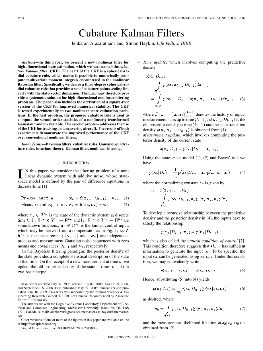 在贝叶斯滤波范式中,状态的后验密度为当时的状态提供了完整的统计描述。在收到一次新的测量后,我们将按两个基本步骤更新时间状态的旧的后验密度。2008年7月2日收到手稿;2008年7月2日、2008年8月29日和9月16日修订。第一次出版于2009年5月27日;当前版本于2009年6月10日出版。这项工作得到了自然科学和加拿大工程研究委员会的支持。作者与汉密尔顿麦克马斯特大学电气和计算机工程系认知系统实验室合作。本文中的一个或多个图形的颜色版本可在其他网站上在线获得。