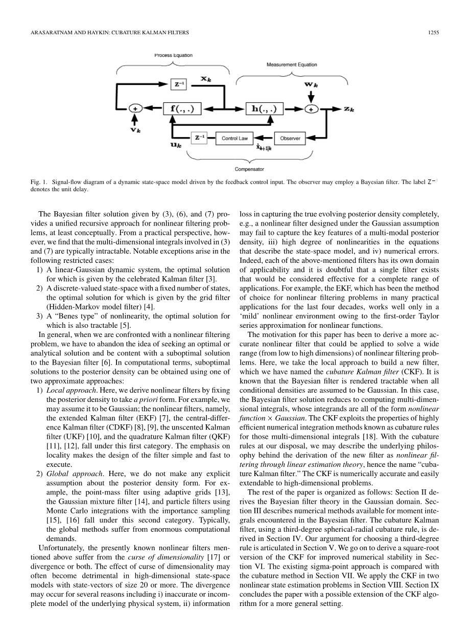 观察者可以用贝叶斯滤波器。标签表示单元延迟(3)、(6)和(7)给出的贝叶斯滤波解至少在概念上为非线性滤波问题提供了一种统一的递推方法。然而,从实际的角度来看,我们发现(3)和(7)中涉及的多维积分通常是难以处理的。在下列受限制的情况下出现了明显