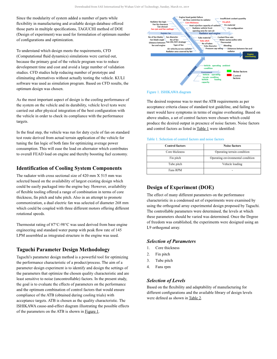 期望的响应是根据标准试验指南的验收标准条款满足ATB要求,如果不满足要求,则会出现发动机过热的症状。在上述研究的基础上,选择了一组能在噪声因素存在下产生所需输出的控制因素。确定了表1中列出的噪声因素和控制因素: