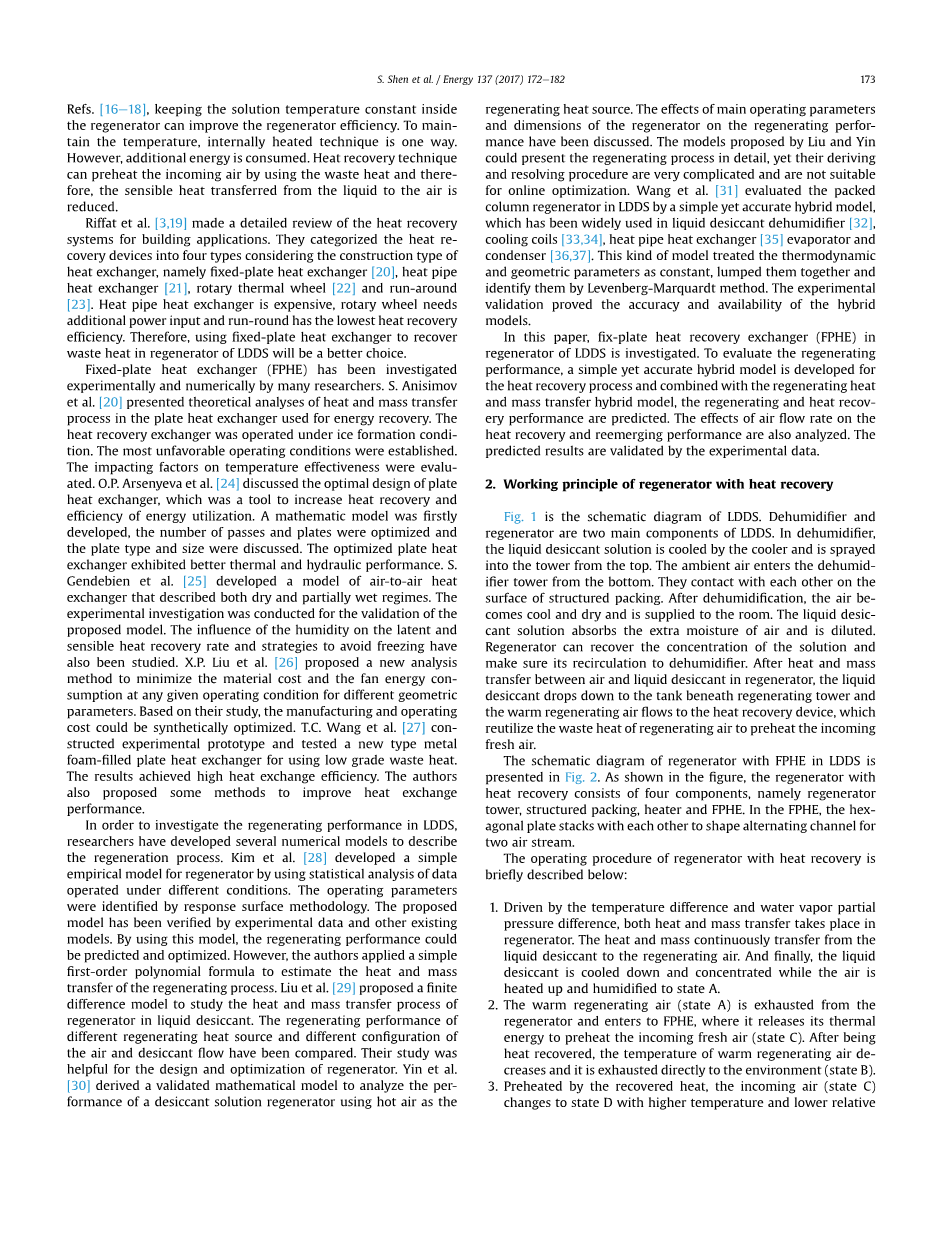 为了研究液体干燥剂除湿系统(LDDS)的热量回收性能,研究者们设计了许多种数值模拟模型来体现热量回收过程的特点。Kim等人通过对不同工况下的得到的数据进行统计分析来为蓄热器设计了一种简单的经验模型,工况的工作参数是通过响应面原则来确定的。提出的模型是通过得到的实验数据以及现有的其他模型通过变型得到的。通过使用这个性能,研究者们可以对蓄热器的工作性能进行预测以及最优化。但是,作者使用了一种简单的一阶多项式公式来估算蓄热器工作过程中的传热及传质过程。Liu等人提出了一种有限差分模型来研究用于干燥剂冷却下的蓄热器中的传热和传质工程。研究者们对不同热量回收热源以及不同的空气和干燥剂流动的排列方式下蓄热器的工作性能进行了比较。他们的研究对于蓄热器的设计和优化是十分有帮助的。Yin等人使用热空气作为热量回收的热源进行研究并得到了分析干燥剂溶液蓄热器的工作性能的有效可靠的数学模型。研究者们就蓄热器的主要工作参数以及几何尺寸对于热量回收过程的影响效果进行了探讨。由Liu和Yin所提出的模型可以展现出热量回收过程中的许多细节,然而由于他们提取数据以及处理问题的过程过于复杂,因而并不适用于在线最优化求解。王等人通过使用一种简单但是精确的水力模型计算了液体干燥剂除湿系统(LDDS)中的填柱式热量回收器,这种水力模型被广泛地应用于液体干燥机除湿器、冷却管、热管换热式蒸发器和冷凝器。这种模型将热力学参数和几何参数设定为常数,将他们归并到一起考虑并使用Levenberg-Marquardt方法来对其进行确定。实验验证证实了这种水力模型的精确性和有效性。