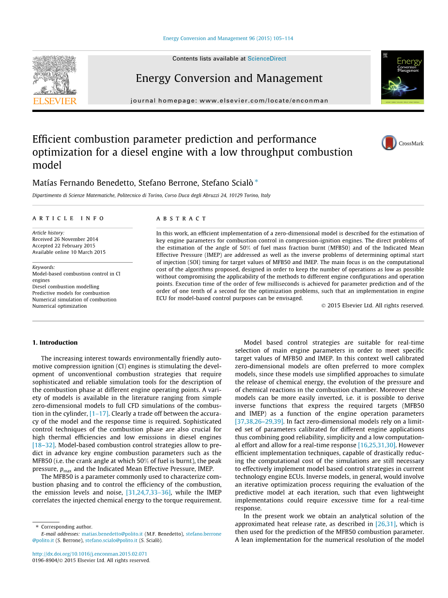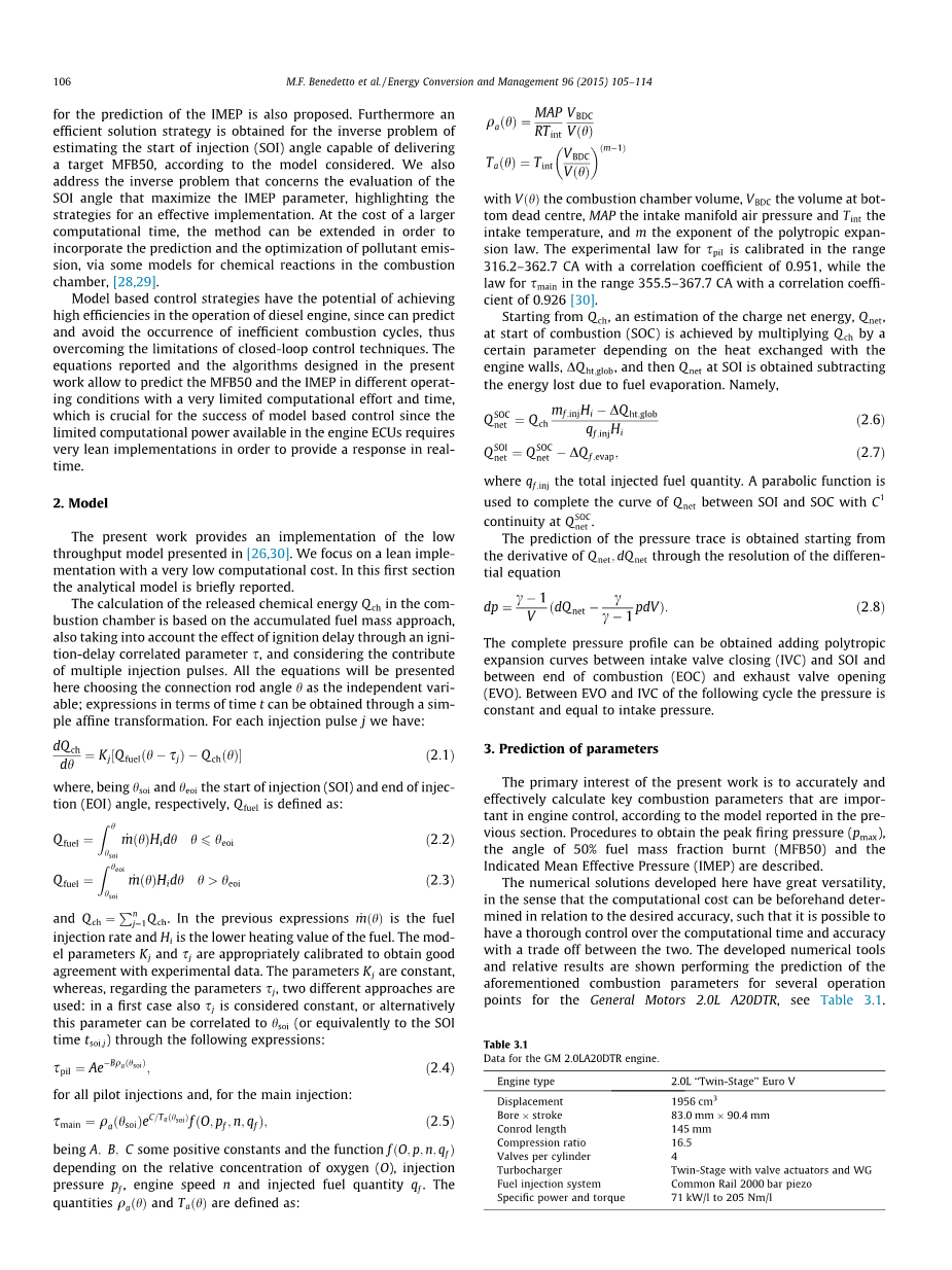 在目前的研究中,我们获得了[26,31]所述的近似放热率的解析解,这个解析解在接下来被用于预测MFB50燃烧参数,为模型的数值解析精益实现提供了可能。此外,根据所考虑的模型,对于喷射开始角度(SOI)的逆问题,也获得了有效的解决策略。我们还解决了评估最大化IMEP参数对应的SOI角的逆问题,使得该策略可以有效实现。该方案通过建立燃烧室化学反应模型,将污染物排放的预测与优化结合起来,但计算时间较长[28,29]。基于模型的控制策略可以实现柴油机运行的高效率,因为我们可以预测和避免低效燃烧循环的发生,从而克服闭环控制技术的限制。在本文中中提出的方程和设计的算法只允许用非常有限的计算工作量和时间预测不同工作条件下的MFB50和IMEP,这对于基于模型的控制的成功至关重要,因为需要非常精细的实现发动机ECU中有限的计算能力,以便提供实时响应。
