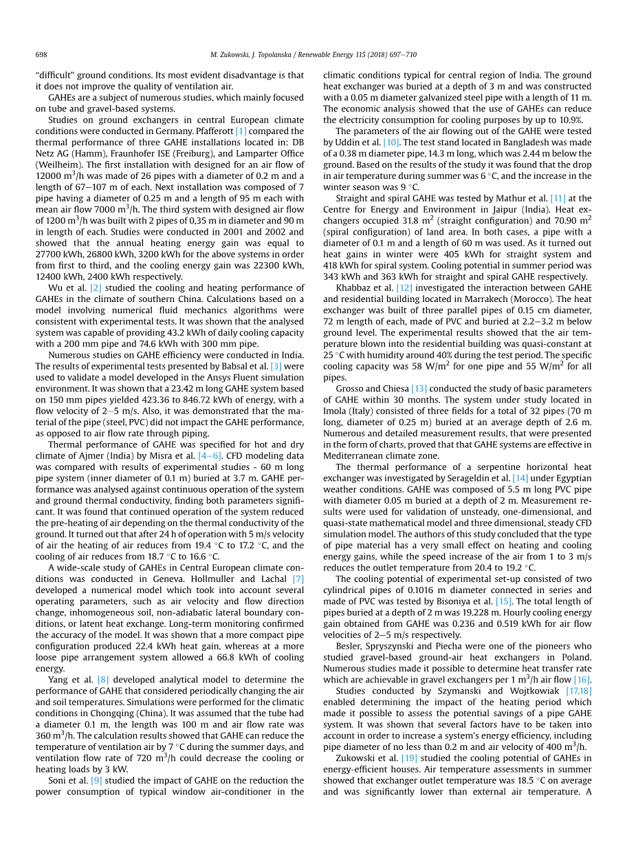 Grosso和Chiesa在30个月内对GAHE的基本参数进行了研究。研究中的系统位于伊莫拉(意大利),由三个场地组成,共32根管道(长度70米,直径0.25米),平均埋在地下深2.6米。以图表的形式提供的大量详细的测量结果,其结果证明,GAHE系统在地中海气候带是有效的。