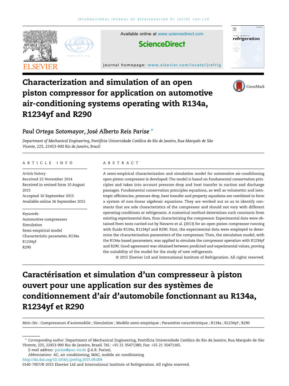 就汽车空调压缩机的建模而言,可以在文献中找到许多研究成果。他们的范围有基础型(Cavalcante等,2008;Fukuta等,1995;Park 等。2004;Tian 等。2004,2006,2007,2009年;Tojo等,1990;Yi等,2004),半经验型(奎瓦斯等人,2008;达尔和克劳福德,1992年;Dirlea等,1998;Kiatsiriroat和Euakit,1997年;SaizJabardo等,2002)和经验型(Eborn等,2005;Joudi等,2003)的例子。关于新制冷剂,汽车交流压缩机上运行的R1234yf的结果的文献,R134a替代新的制冷剂的MAC设计,正在稳步增长。比较R134a-to-R1234yf的插入和TXV调谐测试已被报道,例如,Minor和Spatz(2008),Mathur(2010),Zilio等。 (2011年),戈登等人。(2011),赵等人。(2012),Lee和Jung(2012), 纳瓦罗等人。(2013年),Navarro-Esbr iacute; 等人(2013)和王(2014)。