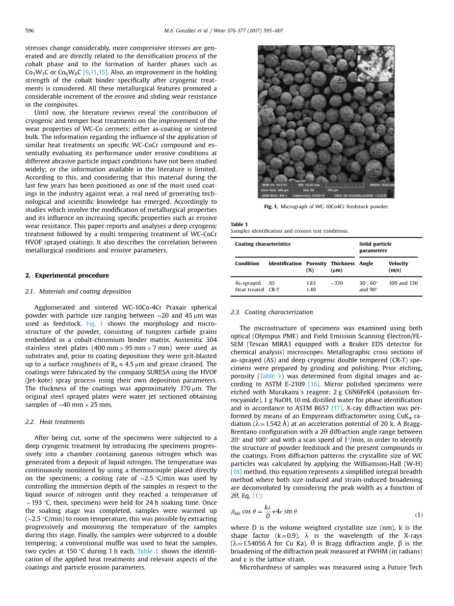 这些材料(WC-CoCr)的性能由其相、硬脆碳化物和韧性粘合剂(软相)决定。考虑到钴作为VIIIB族的一部分,在ODIC表中仅次于铁,因此它在晶体结构中形成类似相的趋势[10]。一些研究者已致力于研究高温(250至1100°C)和深冷(196°C)热处理对WC-Co化合物微观结构的影响及其对其侵蚀或磨损性能的影响[9,12]。高温和低温处理表明,与喷涂状态相比,其磨损性能有了相当大的改善。此外,观察到微观结构和硬度不是影响耐磨性的唯一冶金特征,在逐层涂层生长过程中产生的应力(冲击速度和飞溅物的固态冷却)也具有不可忽视的影响。残余拉应力和压应力是AS喷涂涂层的两个特征,取决于去位置参数[13,14]。经过热处理后,应力状态发生了很大变化,产生了更多的压应力,并与钴相的致密化过程以及诸如Co3W3C或Co6W6C等较硬相的形成直接相关[9,11,15]。此外,还考虑了低温处理后钴粘合剂保持强度的提高。所有这些冶金特性都提高了复合材料的抗冲蚀和滑动磨损性能。