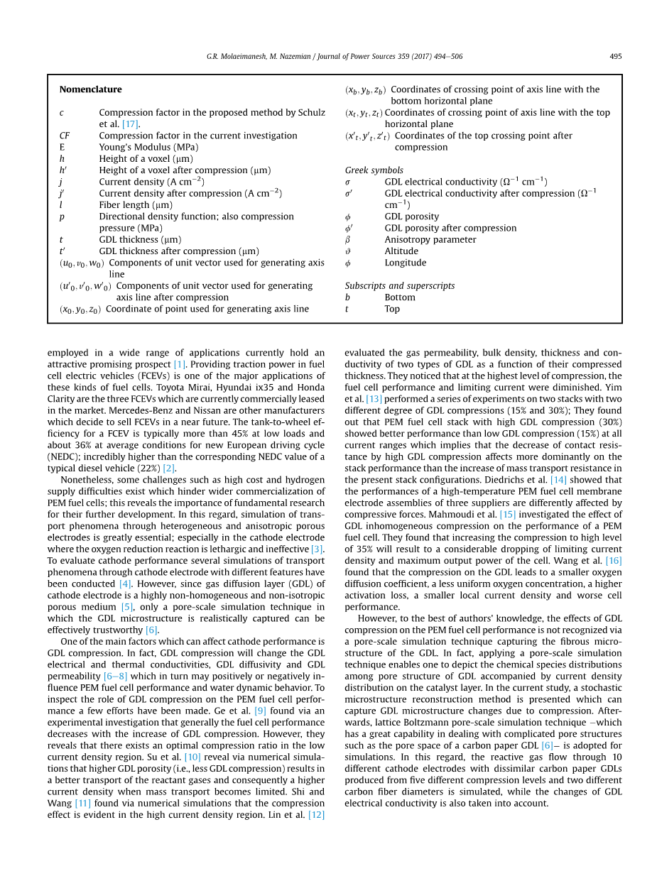 其中一个能影响阴极性能的是气体扩散层的压力。实际上,气体扩散层压力将会改变气体扩散层电和热的传导,GDL扩散率和GDL渗透率或许会相应积极或消极地影响燃料电池的性能以及水的动力特性。为了检测GDL压力在燃料电池性能中的重要性,人们已经做出了一些努力。有人通过一个实验调查发现通常随着GDL压力的增加燃料电池的性能降低。然而,他们揭示出在低电流密度区域存在一个最佳压力比。有人通过数字仿真揭示出更高的GDL多孔性(更小的GDL压力)导致更好的反应气体传输效果,并且当质量传输变有限时导致更高的电流密度。Shi和Wang通过数字仿真揭示出压力影响在高电流密度区域是明显的。Lin等人估计了气体的渗透性,体积密度,厚度和两种类型GDL的传导率,作为它们压缩厚度的函数。他们指出在最高的压力状态,燃料电池的性能和限制电流密度降低。Yim等人在两个拥有不同GDL压力程度的电池堆(15%和30%)进行了一系列的实验;他们发现在所有的电流范围,有较高GDL压力的质子交换膜燃料电池堆(30%)比较低的GDL压力(15%)表现出更好的性能,这表明在如今的电池堆结构下,在高GDL压力下的接触阻力减小对电池堆的性能影响比质量传输阻力的减小更具主导作用,Diredrichs等人展示了由三个供应商提供的高温质子交换膜燃料电池膜电极组的性能受到压缩力不同程度的影响。Mahmoudi等人研究了GDL不均匀压力对质子交换膜燃料电池的性能影响。他们发现增加压力到35%的高水平,将导致限制电流密度较大的降低,以及电池最大的输出功率。Wang等人发现对GDL的压力导致了氧气扩散率的降低,不均匀的氧气聚集,更高的活化损失,更小的当地电流密度以及更差的电池表现。然而,据作者所知,GDL压力对质子交换膜燃料电池性能的影响并没有通过一种捕捉GDL纤维结构的仿真技术而得出。实际上,运用一种孔隙尺度仿真技术使我们能够描述化学物质在GDL孔隙结构中的分布以及催化层电流密度的分布。在目前的研究中,展示了一种随机微观结构重组方法,它能捕捉GDL微观结构在压力下的改变。然后,格子玻尔兹曼孔隙尺度仿真技术(能很好的处理类似于GDL碳纸孔隙空间的复杂孔隙结构),被用于仿真。在这点上,气体通过由5种不同压力水平和2种不同碳纸纤维直径组成的10种含有不同GDL碳纸的阴极的过程得以仿真,同时GDL电传导率也被考虑在内。