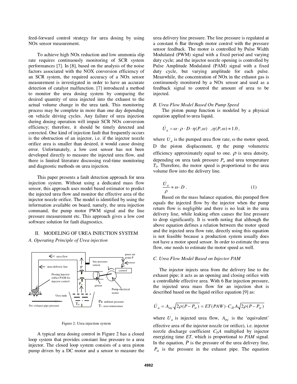 其中a是注入尿素流量,Ainj是喷射器喷嘴(或孔)的“等效”有效面积,即喷射器喷嘴流量系数CDA乘以与PAM信号成比例的喷射器激励时间ET。在等式中,P是尿素输送管的压力,Pst是排气管中的压力。该等式公开了尿素质量流量主要由一些物理和环境因素决定,例如喷射器孔口的有效面积和输送管的压力以及喷射的尿素密度rho;。由于喷油器喷嘴的“等效”有效面积由PAM信号控制,我们将方程改写为