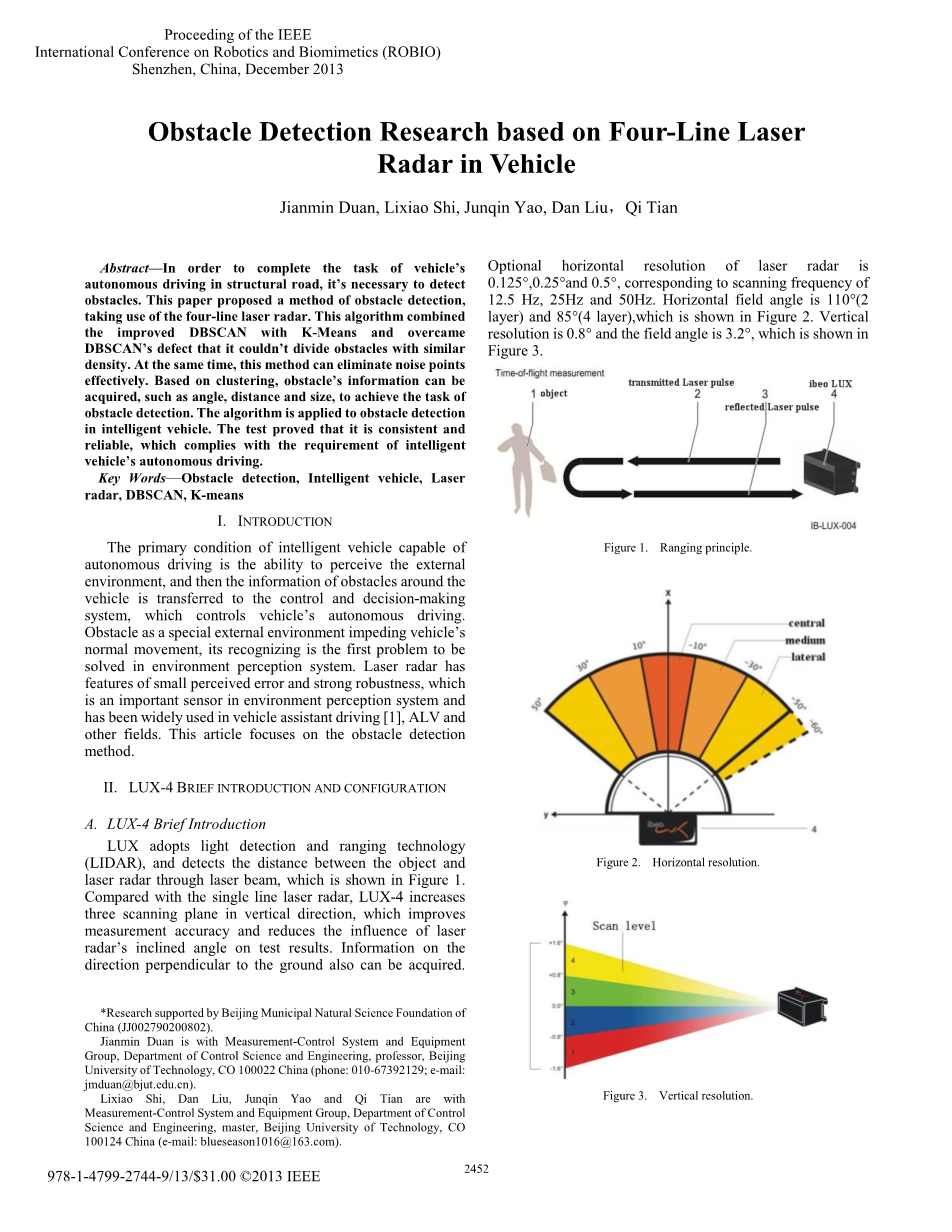 摘要—为了完成车辆在结构性道路上的自主驾驶任务,有必要检测障碍物。本文提出了一种利用四线激光雷达进行障碍物检测的方法。该算法将改进后的DBSCAN与K-Means相结合,克服了DBSCAN无法对具有相似密度的障碍物进行划分的缺陷。同时,该方法可以有效地消除噪声点。基于聚类,可以获取障碍物的信息,如角度,距离和大小,从而完成障碍物检测任务。该算法适用于智能车辆的障碍物检测。实验证明其一贯可靠,符合智能车辆自动驾驶的要求。