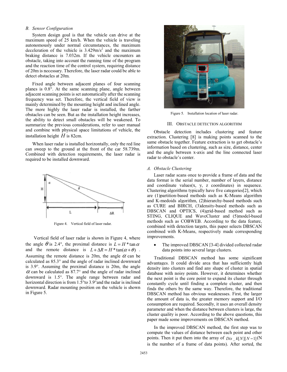 激光雷达的垂直视野如图4所示,其中角度theta;是2。4°,近端距离是L = H * tanalpha; 和远程距离是L ∆R = H * tan(alpha; theta;)。假设远程距离是20米,角度alpha;可以计算为85。3°,雷达倾斜角度为3。9°。假设近端距离为20米,角度alpha;可以计算为87。7°,雷达向下倾斜角度为1。5°。雷达与水平方向之间的角度范围为1。5°至3。9°,雷达向下倾斜。图5显示了车辆上的雷达安装位置。