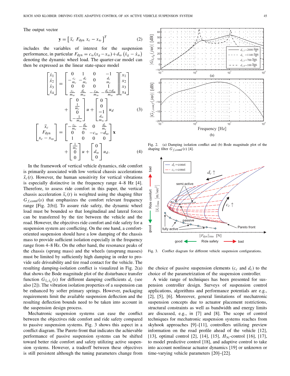 本文提出了一种控制方法,机电一体化悬架系统的能力是通过根据当前驾驶情况动态调整控制器参数。为此,设计了自适应控制器结构,它是根据动态车轮负载和悬架偏转指定的当前行驶状态来调度控制器参数。由此产生的快速自适应悬架可以最大限度地提高乘坐舒适性,只要动态车轮负载和悬架的约束不会被违反。为了突出由控制概念引起的改进,而不是分析执行器约束的局限性,本文选择了一个完全主动的悬架配置作为硬件架构。[注意,所提出的技术也可以应用于缓慢的主动或半主动悬架,主动机电一体化悬架系统。]所提出的控制器设计方法代表了作者[34]以前的概念的增强,已经在线性模型中进行了仿真测试。本文论述的主要新方法是在控制器设计中要考虑的方面,以保证系统的稳定性以及实际框架中的实验性能验证。对于线性二次调节器(LQR)的基于优化的调节,采用了详细的非线性四分之一车辆模型。为了评估控制器性能,所提出的概念与已建立的基于天钩的控制策略以及传统的线性二次最优控制器进行比较。有关结果的更详细介绍,请参阅[35]。