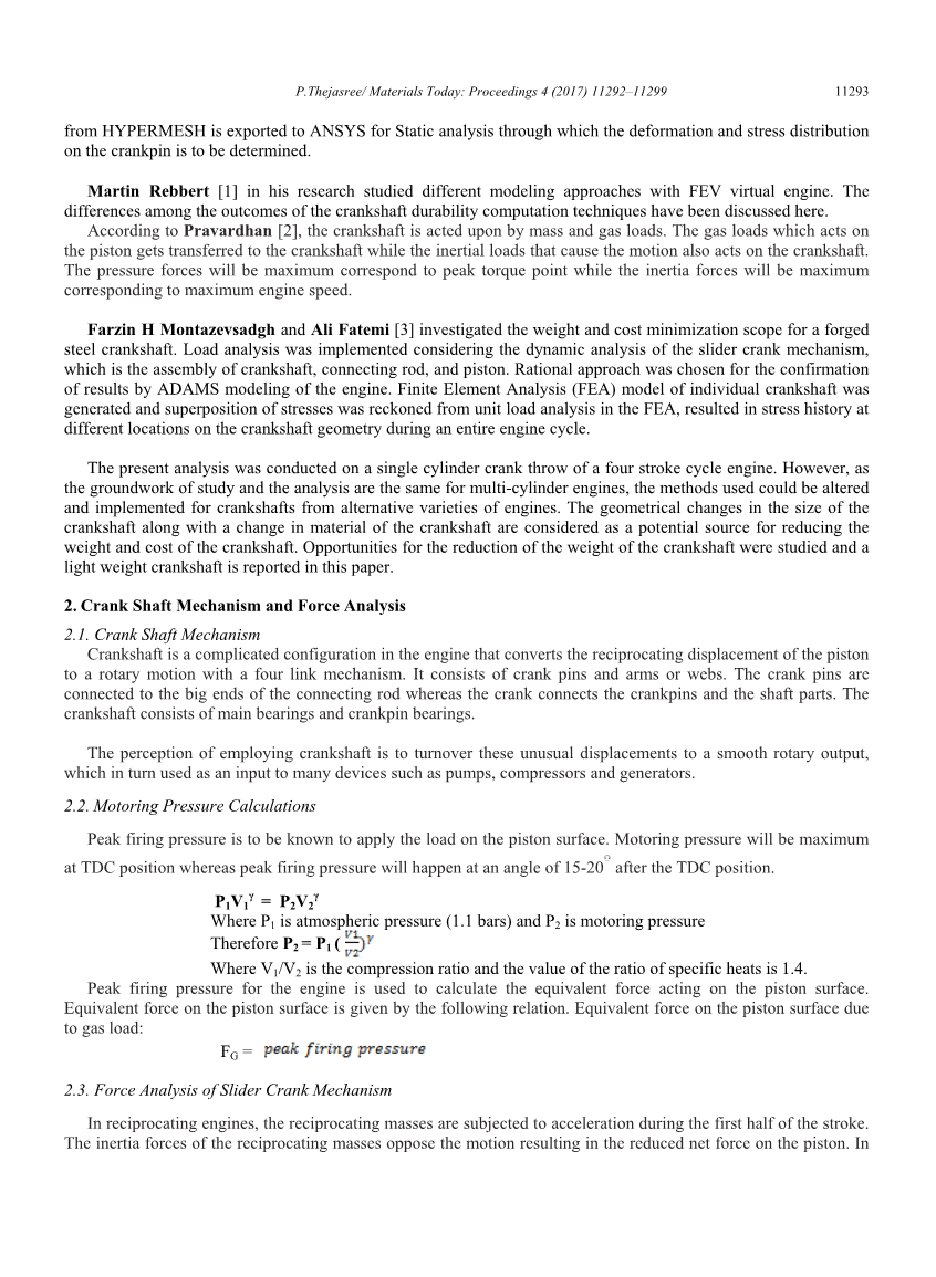 根据Pravardhan的说法,曲轴是由质量和气体载荷作用的。在活塞上作用的气体载荷被转移到曲轴上,而引起运动的惯性载荷也作用于曲轴上。压力力最大对应于峰值扭矩点,而惯性力则最大与最大发动机转速相对应。