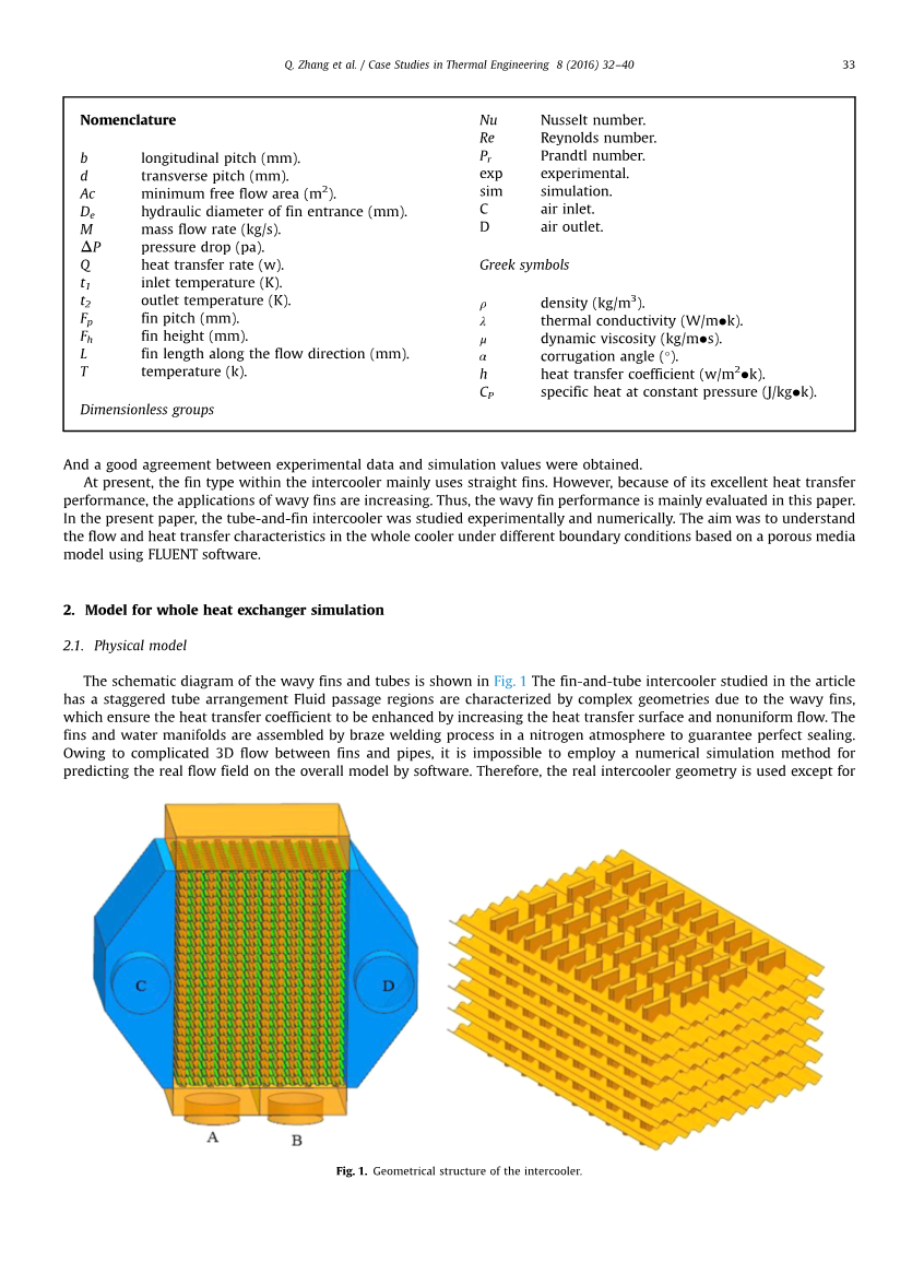 波纹翅片管的原理如图1,研究显示,管翅式中冷器的波纹翅片具有复杂的几何形状,因此,存在着错列管排液通道区域,这可以保证是通过增加换热表面面积和提高非均匀流流量来提高传热系数。翅片和歧管在氮气气氛下通过钎焊工艺组装,保证完美密封。然而。由于翅片管之间的三维流动比较复杂,用软件模拟整个模型的真实流场是不可能的。因此,在实验中选取的中冷器用多孔介质模型来替代波纹翅片,以减少计算量。本研究所使用的实际产品的几何参数和材料见表1。要分析流动,可以用CFD方法计算预测流动阻力特性。在这项研究中,我们将要把流体域和固体域之间的热传递进行结合计算。