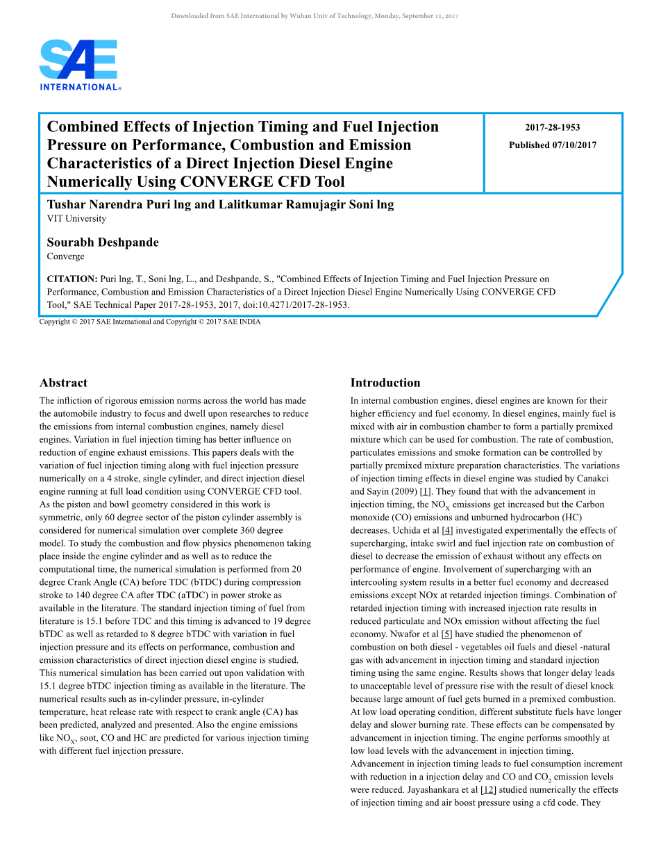 相对于其他内燃机,柴油发动机有较高的效率和燃料经济性。在柴油发动机中,大部分的燃料在燃烧室中与空气混合,形成可燃预混合气体。可以通过控制可燃预混合气体的形成来控制燃烧速率,微粒排放和碳烟的生成。Canakci和Sayin(2009)[1]研究了改变喷油正时对柴油机的影响。他们发现,随着喷油正时的提前,NOx排放量增加,但CO排放和HC排放减少。 Uchida等人[4]通过实验探究了改变进气涡流和燃油喷射速率从而减少废气排放而对发动机性能没有任何影响的方法。延迟喷油正时同时使用增压中冷系统可以使发动机的燃油经济性更好,排放更少,但NOx排放会增加。延迟喷油正时同时增加喷油速率会使颗粒物和NOx排放减少而不影响燃油经济性。Nwafor等人[5]研究了同一台发动机在提前喷油正时和标准喷油正时下柴油-植物油燃料和柴油-天然气的燃烧现象。结果表明,延迟喷射时间太久会导致缸内压力急剧上升,使柴油机产生爆震,因为在这期间,大量的燃料在预混合过程中燃烧。在低负荷运行条件下,延迟喷射时间越长,燃烧速率越慢。这些影响可以通过喷油正时的提前来补偿。随着喷油正时的提前,发动机可以在低负荷下平稳运行。喷油正时的提前会导致燃料消耗量增加,喷油的延迟时间减少,CO和COX排放水平也会降低。Jayashankara等人[12]使用CFD软件数值模拟了喷油正时和增压压力的变化对发动机的影响,他们通过Payri等人[6]完成的实验验证了他们的分析。他们从实验中发现,随着喷油正时的提前,NOx排放量,气缸压力和气缸温度都会提高。他们还发现,与自然吸气发动机相比,增压中冷发动机会导致更多的NOx排放量。Han等人[2]对多点喷射和多次喷射情况进行了数值研究。他们发现多点喷射显著降低了NOx排放,但多次喷射时,碳烟排放会增加,NOx排放保持不变。Assanis等人[9]数值模拟了多点喷射对CI发动机燃烧和排放的影响。他们表示,前导喷油和后喷油会导致碳烟排放减少。Ashrafur Rahman等人[13]研究了喷油正时对以生物柴油,柴油和乙醇混合物作为燃料的发动机的影响。他们发现,如果柴油机的喷油正时提前,那么NOx的排放会增加,CO和HC排放会减少。但是在喷油正时延迟时,NOX排放会显著减少。R.Thundil karupparaj等人[14]数值模拟了喷油正时提前对柴油机的影响。他们表示,随着喷射正时提前,缸内峰值压力上升,NOx排放增加,而碳烟排放减少。他们还表示,喷油正时提前可以降低NOx的排放,可将EGR增加到40%。Abdullah等人[26]通过实验研究如何优化多点喷射CI发动机在不同工况下的排放。他的实验结果表明,高压多点喷射结合冷却的EGR会比低压多点喷射而没有EGR的情况下的碳烟和NOX排放更优。