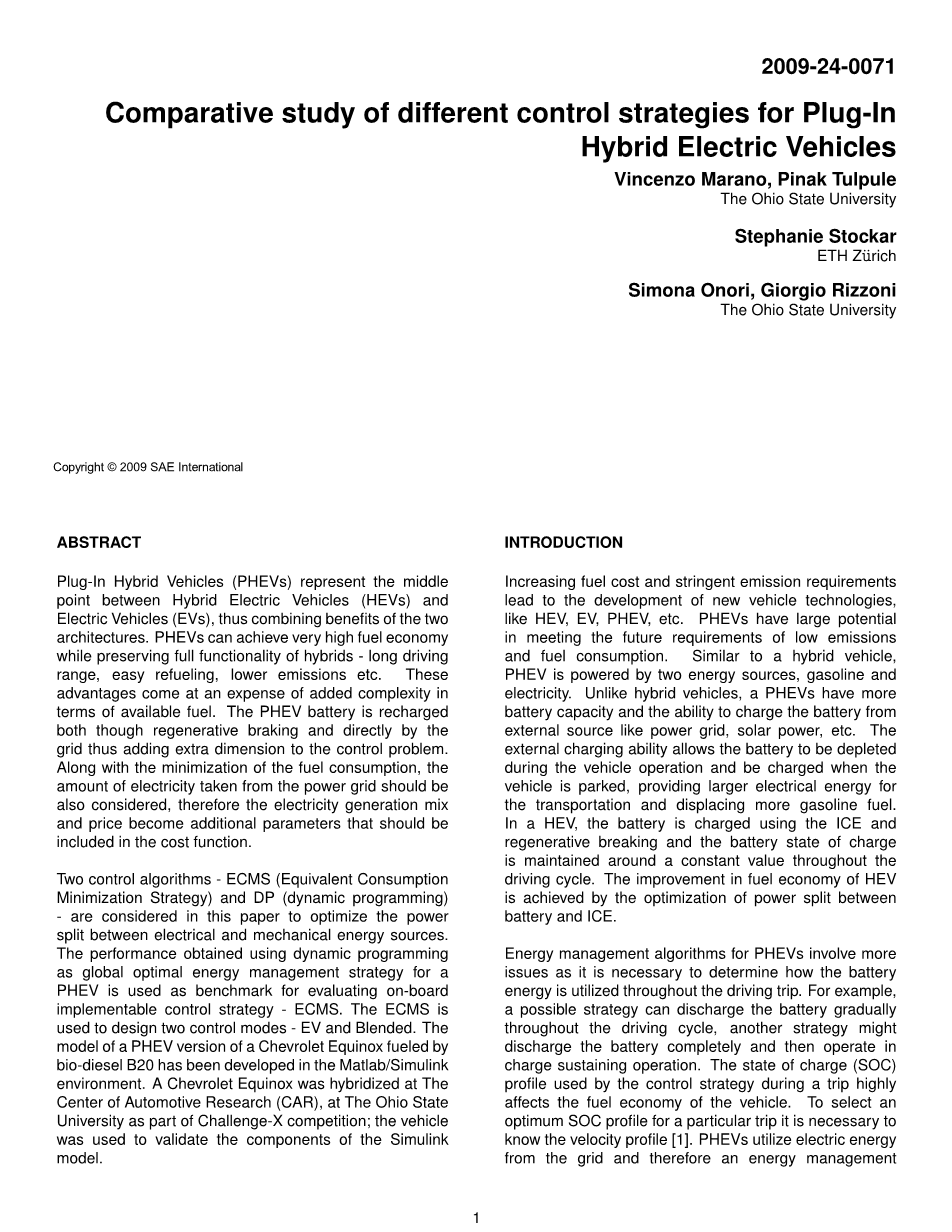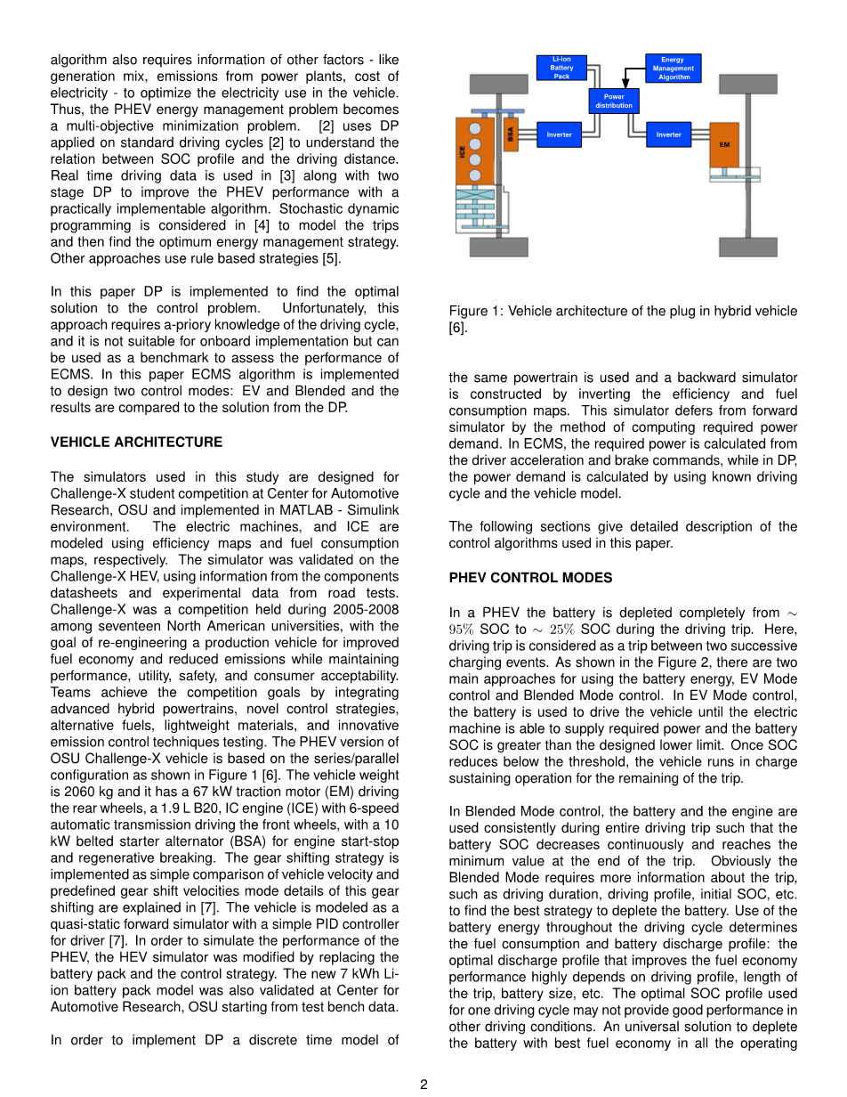 插电式混合动力汽车(PHEVs)介于混合动力汽车(HEVs)和电动汽车(EVs)两者概念之间,因此结合了两种结构的优点。PHEVs可以实现非常高的燃油经济性,同时保持混合动力的全功能——长距离行驶里程,简单地加油,更低的排放等等。这些优点是以可获得的燃料的复杂性为代价的。PHEV电池的充电方式是再生制动和直接通过电网,从而增加了控制问题的额外计算。随着燃料消耗的最小化,从电网获取的电量也应该被考虑在内,因此发电的混合和价格成为了成本函数中应该包含的额外参数。