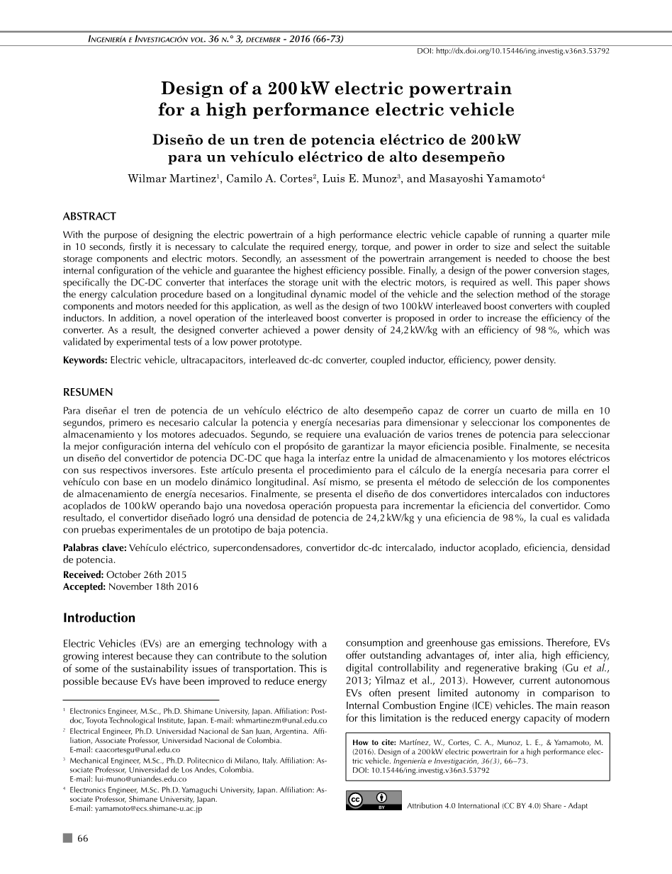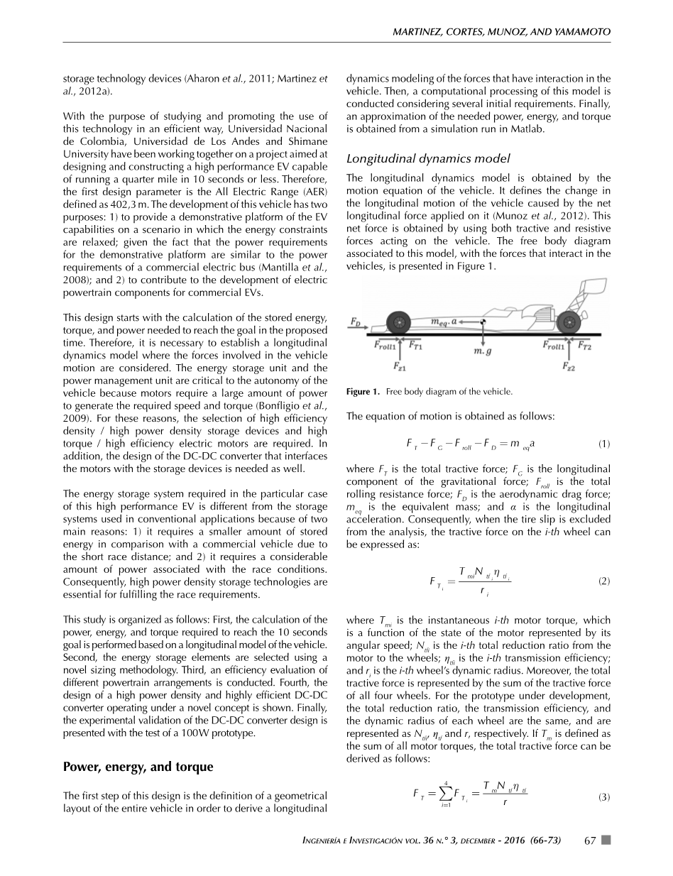 电动汽车(EVs)是一种新兴的技术,人们越来越感兴趣,因为它们可以帮助解决交通运输的一些可持续性问题。这是有可能的,因为EVs已经被改进,以减少能源消耗和温室气体排放。因此,电动汽车具有突出的优势,特别体现在高效率,数字可控性和再生制动方面。然而,与内燃机(ICE)车辆相比,目前的自动电动汽车往往具有有限的自主性。这一限制的主要原因是现代存储技术设备的能量能力下降。为了有效地研究和推广这一技术的使用,国家大学、哥伦比亚大学、洛杉矶大学和世安大学一直在共同研究一个项目,设计和构造高性能的电动汽车,能够在10秒或更短的时间内跑完四分之一英里。因此,第一个设计参数为全电动范围(AER)定义为402,3 m。这辆车的发展有两个目的:1)在能源约束较少的情况下,提供电动汽车能力的演示平台;鉴于演示平台的功率要求与商业电动汽车的功率要求类似(Mantilla等,2008);2)为商业电动汽车的电力传动部件的开发做出贡献。这个设计从计算储存的能量、扭矩和在建议时间达到目标所需的能量开始。因此,有必要建立一个纵向动力学模型,考虑车辆运动中涉及的力。能量存储单元和电源管理单元对车辆的自主性至关重要,因为电动机需要大量的功率来产生所需的速度和扭矩(Bonfligio等,2009)。由于这些原因,需要选择高效密度/高功率密度存储装置和高扭矩/高效率电动机。此外,还需要设计与存储设备接口的DC-DC转换器。在这种高性能电动汽车的特殊情况下所需要的储能系统与传统应用中所使用的存储系统不同,主要有两个原因: 1)与商业车辆相比,由于短距离的距离,需要较少的储能;2)它需要相当数量的与比赛条件相关的力量。因此,高功率密度存储技术是满足比赛要求的关键。
