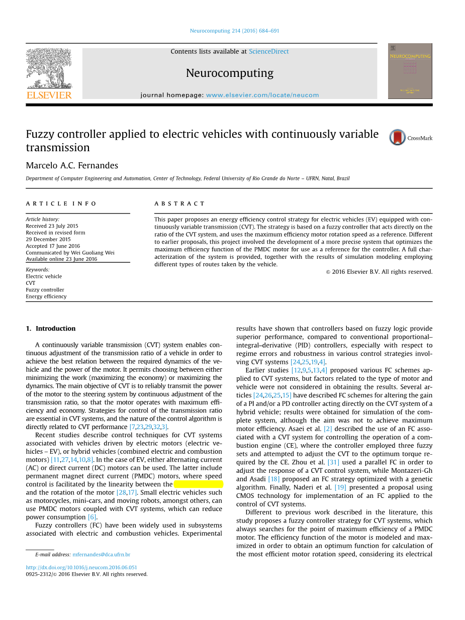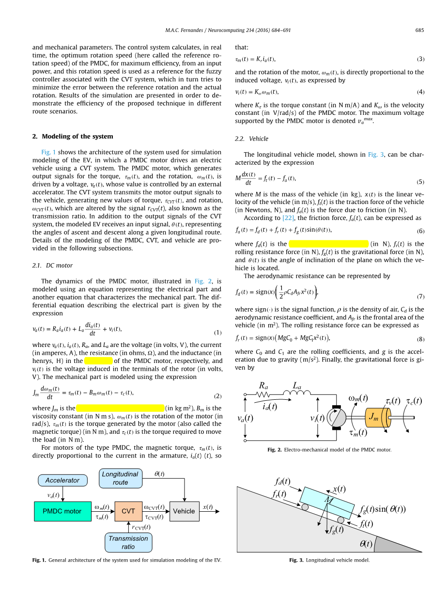 无级变速器(CVT)系统能够连续调节车辆的传动比,以实现车辆所需动力和电机功率之间的最佳关系。它允许在最小化工作(最大化经济)或最大化动态之间进行选择。 CVT的主要目标是通过连续调节传动比将电机的功率可靠地传递到转向系统,从而使电机以最高的效率和经济性运行。控制传动比的策略在CVT系统中至关重要,控制算法的性质直接与CVT性能有关[7,23,29,32,3]。最近的研究描述了与车辆驱动相关的CVT系统的控制技术通过电动机(电动车辆 - EV)或混合动力车辆(电动和燃烧电动机)[11,27,14,10,8]。对于EV,可以使用交流(AC)或直流(DC)电动机。后者包括永磁直流(PMDC)电机,其中通过感应电压和电机旋转之间的线性来促进速度控制[28,17]。诸如摩托车,小型车和移动机器人等小型电动车辆可以使用与CVT系统耦合的PMDC电机,这可以降低功耗[6]。模糊控制器(FC)已经广泛用于与电子相关的子系统和燃烧车辆。实验结果表明,与传统的比例 - 积分 - 微分(PID)控制器相比,基于模糊逻辑的控制器提供了优越的性能,尤其是涉及CVT系统[24,25,19,4]早期的研究[12,9,5,13,4]提出了适用于CVT系统的各种FC方案,但与获得结果时未考虑与电动机和车辆类型有关的因素。几篇文献[24,26,25,15]已经描述了FC方案,用于改变直接作用于混合动力车辆的CVT系统的PI和/或PD控制器的增益;虽然目的不是为了达到最大的电机效率,但为了仿真整个系统获得了结果。 Asaei等人[2]描述了使用与CVT系统相关的FC来控制内燃机(CE)的操作,其中控制器采用三个模糊集合并试图将CVT调节到CE所需的最佳扭矩。周等人[31]为了调整CVT控制系统的响应,使用了一个并行FC,而Montazeri-Gh和Asadi [18]提出了一种用遗传算法优化的FC策略。最后,Naderi等人在文献[19]提出了一种使用CMOS技术实现用于控制CVT系统的FC的提议。与文献中描述的以前的工作不同,本研究提出了一种用于CVT系统的模糊控制器策略,该策略总是搜索最大点PMDC电机的效率。电机的效率功能是建模和最大和机械参数。为了最大效率,控制系统实时计算PMDC的最佳转速(这里称为参考转速),以便从输入功率中获得最大效率,并且该转速被用作模糊控制器的参考,该模糊控制器与CVT系统,该系统反过来试图最小化参考旋转和实际旋转之间的误差。为了证明所提出的技术在不同路线情况下的效率,给出了仿真结果。