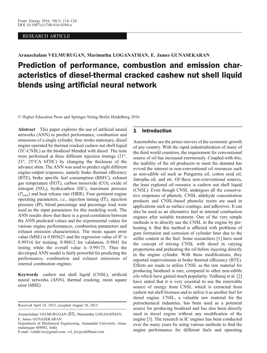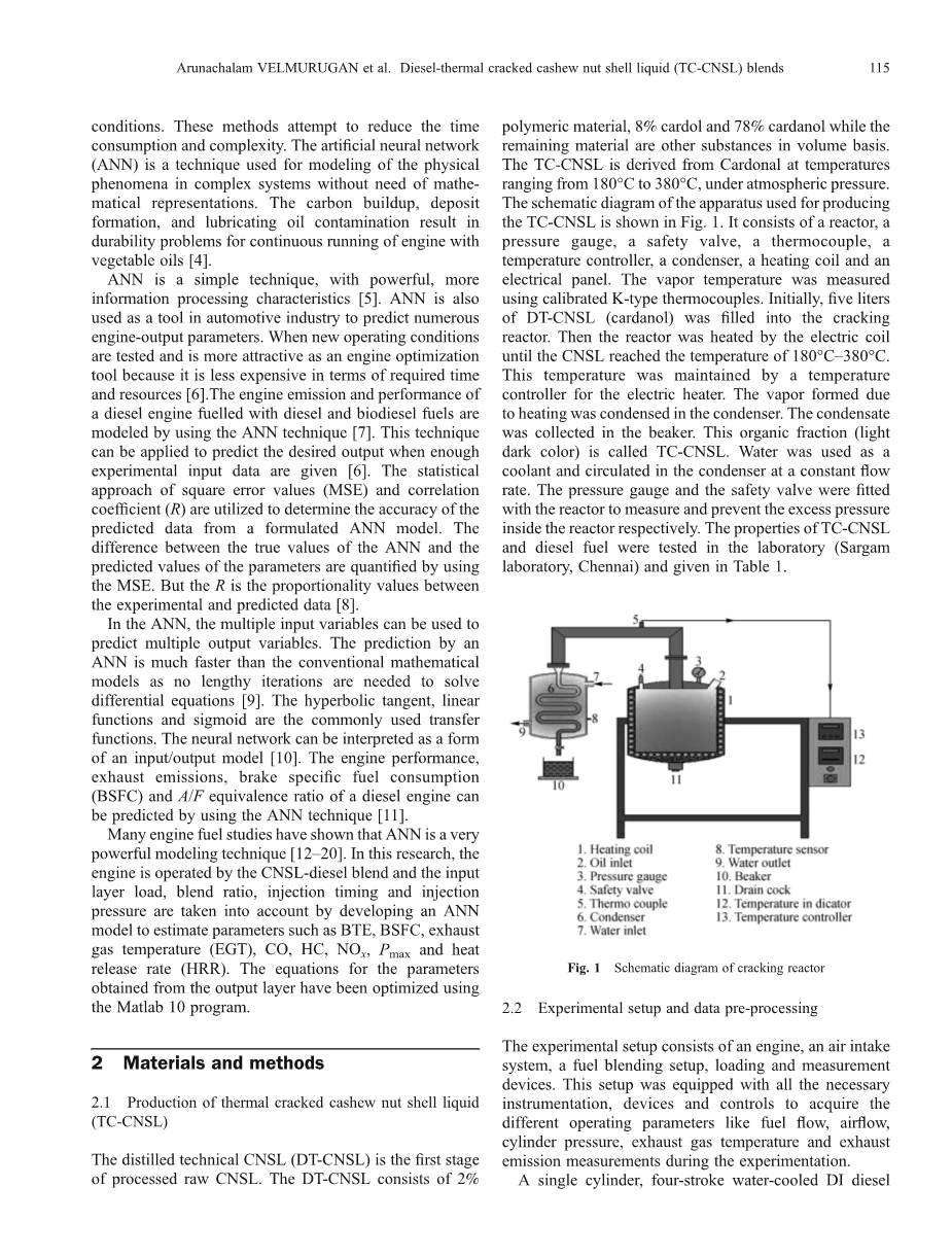 汽车是任何国家经济增长的主要推动力量。 随着许多第三世界国家的快速工业化,传统石油来源的需求量大大增加。与此同时,石油生产商无法满足需求,已经把兴趣转向了非常规石油资源,例如水黄皮油,棉籽油,麻风树油等非食用油。在这些非常规 石油来源中,勘探最少的是腰果壳油(CNSL)。尽管CNSL会产生苯酚的所有的保守反应,但CNSL醛浓度产品和CNSL基酚醛树脂可用于表面涂料和粘合剂等应用。 经过适当的处理后,它也可以用作内燃机的替代燃料。其中一种非常简单的方法是通过预热来直接在发动机中使用CNSL。 但是这种方法由于燃料中的硫含量而会导致胶质形成和气缸套腐蚀的问题。 一些研究人员[1]已经提出了将CNSL与柴油混合成不同比例的概念,并在直接喷射到发动机气缸中之前预热油。 通过这些修改,他们报告了制动器热效(BTE)的改进。 与其他获得非常普及的非食用油相比,努力利用CNSL作为生产生物柴油的原材料很少见。 Vedharaj等人[2]指出,从腰果壳生物质提取可再生能源CNSL并将其用作柴油发动机的另一种燃料是非常必要的。CNSL作为一种有价值的石化工业原料,已被用作生产生物柴油的潜在来源,并且直接用于柴油发动机而无需对发动机进行任何改造[3]。 多年来,IC发动机的研究通过使用各种方法来研究不同燃料和运行条件下的发动机性能,这些方法都要试图减少时间消耗和复杂性。 人工神经网络(ANN)是一种用于对复杂系统中的物理现象进行建模但不需要数学表征的技术。碳积累,沉积物的形成和润滑油的污染是导致发动机连续运行植物油时发生故障的诱导因素[4]。