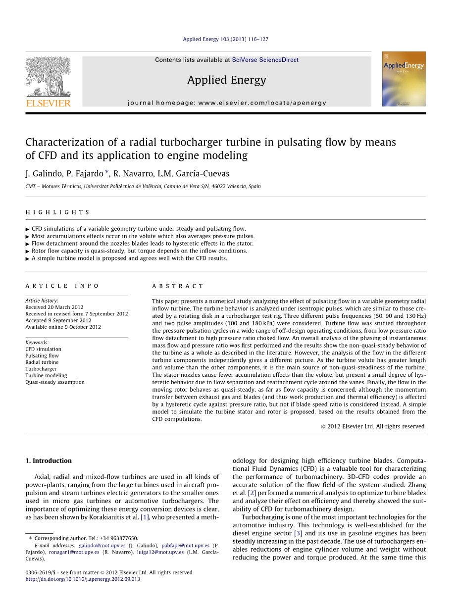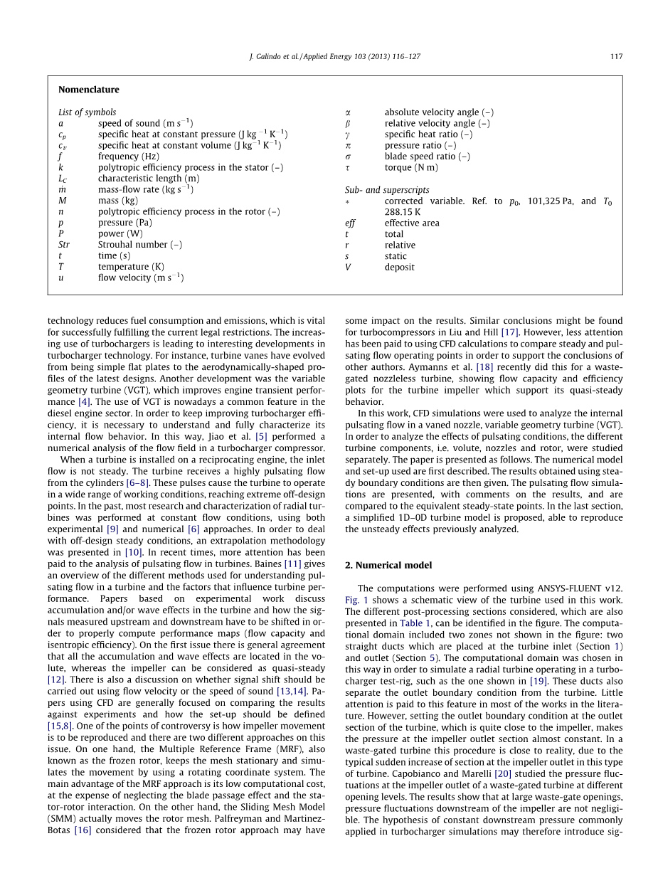 涡轮增压是汽车行业最重要的技术之一。 这项技术在柴油发动机及其在汽油发动机中的应用在过去的十年里稳步增长,已经很成熟了。 涡轮增压器的使用en-无需减少发动机汽缸体积和重量降低产生的功率和扭矩 [3]。 同时这项技术降低了燃料消耗和排放,这是至关重要的为成功履行目前的法律限制。 增加 涡轮增压器的使用正在导致有趣的事态发展涡轮增压器技术。 例如,涡轮叶片已经发展从简单的平板到空气动力学形状的pro-最新设计的文件。 另一个发展是变量几何涡轮机(VGT),其改善发动机瞬态性能 - mance [4]。 VGT的使用是当今通用的功能柴油机部门。 为了不断改进涡轮增压器效率,有必要了解并充分描述其特点内部流动行为。 这样,焦等人。 [5]做了一个数值分析涡轮增压器压缩机中的流场。当涡轮机安装在往复式发动机上时,入口流量不稳定。涡轮机接收高度脉动的流量从气瓶[6-8]。这些脉冲导致涡轮机运转在广泛的工作条件下,达到极端的非设计点。过去,大多数研究和表征径向涡流 - 在恒定的流动条件下使用两者来进行实验[9]和数值[6]方法。为了处理具有非设计稳定条件和推断方法在[10]中提出。近来,更多的关注支付给涡轮机脉动流量的分析。 Baines [11]给出概述了用于理解pul-在涡轮机中选择流量以及影响涡轮机的性能的因素