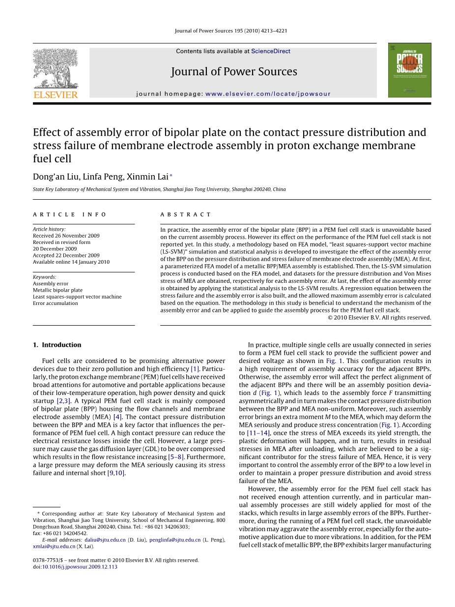 然而,目前PEM燃料电池组的组装错误尚未得到足够的重视,特别是对于大多数堆叠,手动组装过程仍然被广泛应用,这导致BPP的大组装错误。此外,在PEM燃料电池组运行期间,不可避免的振动可能会加重组装误差,特别是对于汽车应用而言,由于更多的振动。此外,对于金属BPP的PEM燃料电池堆,由于其塑性特性(例如回弹),BPP表现出较大的制造误差[15-17],这又使组装误差的影响更严重。一方面,应该控制和降低BPP的装配误差,以提高PEM燃料电池堆的性能。另一方面,基于当前的组装过程和制造过程,很难将组装错误控制到非常低的水平。此外,如果装配误差太小,则PEM燃料电池堆的组装和制造成本将急剧增加,这是不可接受的并且与PEM燃料电池的成本降低相冲突。因此,需要研究BPP的组装误差对PEM燃料电池堆的接触行为的影响,以便引导组装过程,并进一步在性能和组装精度之间取得折衷。尽管如此,据我们所知,这些研究尚未见文献报道。关于PEM燃料电池堆释放部件的制造和负载变化的影响,只有几项研究。Vlahinos等人[18]首先研究了石墨BPP在MEA压力分布上的材料和制造的变化。Zhang等人[19]为PEM燃料电池开发了FEA模型,并研究了不同负载分布对碳基BPP和GDL之间接触电阻的影响。Zhan等人[20]用计算模型研究孔隙度分布变化对通过GDL的液态水通量的影响。在我们之前的一项研究[21]中,研究了装配参数变化对PEM燃料电池中GDL压力分布的影响。获得了用于PEM燃料电池堆的组装参数的可靠解决方案。