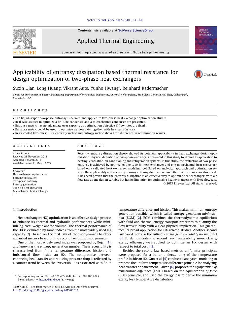 本研究的动机是探索对于换热器在供热,通风,空调和制冷(HVAC&R)系统中应用火积,即空气制冷剂HXs进行相变过程中进行HX优化的适用性。本研究解决了两个重要问题:如何在工作中的两相流体中应用火积,以及以最大容量为目标和以最小火积热阻为目标的区别。