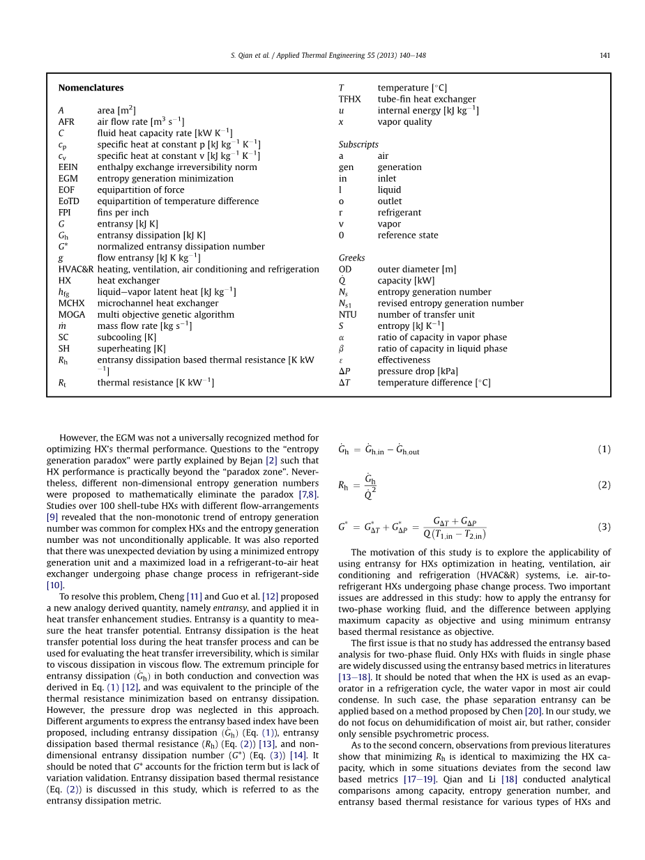 但是,EGM并不是公认的优化HX热性能的方法。Bejan [2]部分解释了“熵产生悖论”的问题,使得HX的性能实际上超出了“悖论区”。然而,提出了不同的无量纲熵数来消除悖论[7,8]。研究了100种不同流量排列的管壳HXs [9]发现熵生代数的非单调趋势对于复杂的HXs是常见的,并且熵生成数不是无条件适用的。另据报道,在制冷剂侧[10]中经历相变过程的制冷剂用在空气热交换器中,通过使用最小熵产生单元和最大负荷出现意外偏差。