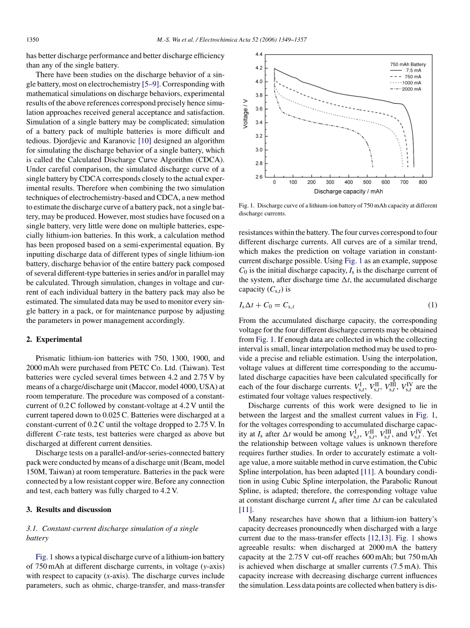 图1显示了锂离子电池在不同放电电流下的典型放电曲线,电压(y轴)相对于容量(x轴)为750 mAh。 放电曲线包括电池内的参数,例如欧姆,电荷转移和质量转移电阻。 这四条曲线对应于四种不同的放电电流。 所有曲线都具有相似的趋势,这使得对恒流放电中电压变化的预测成为可能。 以图1为例,假设C0为初始放电容量,Is为系统放电电流,放电时间Delta;t后累计放电容量(Cs,t)为