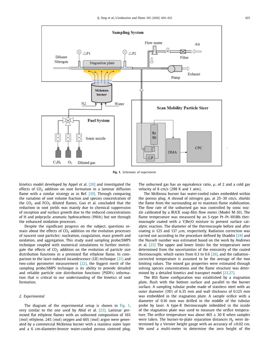 尽管在这一课题上取得了重大进展,但二氧化碳添加对新生烟尘颗粒的演变过程的影响仍然存在一些问题:成核、凝结、质量增长和氧化以及聚集。本研究采用取样探头/开关电源技术与数值模拟来进一步探讨CO2添加在预混平面乙烯火焰对颗粒尺寸分布函数的演化的影响。在对激光诱导白炽(LII)技术和双色高温计测量的比较中,得出采样探头/开关电源技术的最大优点是它能够提供详细可靠的粒径分布函数(PSDFs)信息,这对我们理解烟尘形成的动力学很关键。