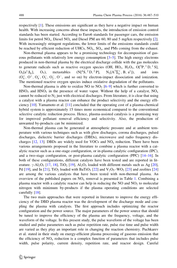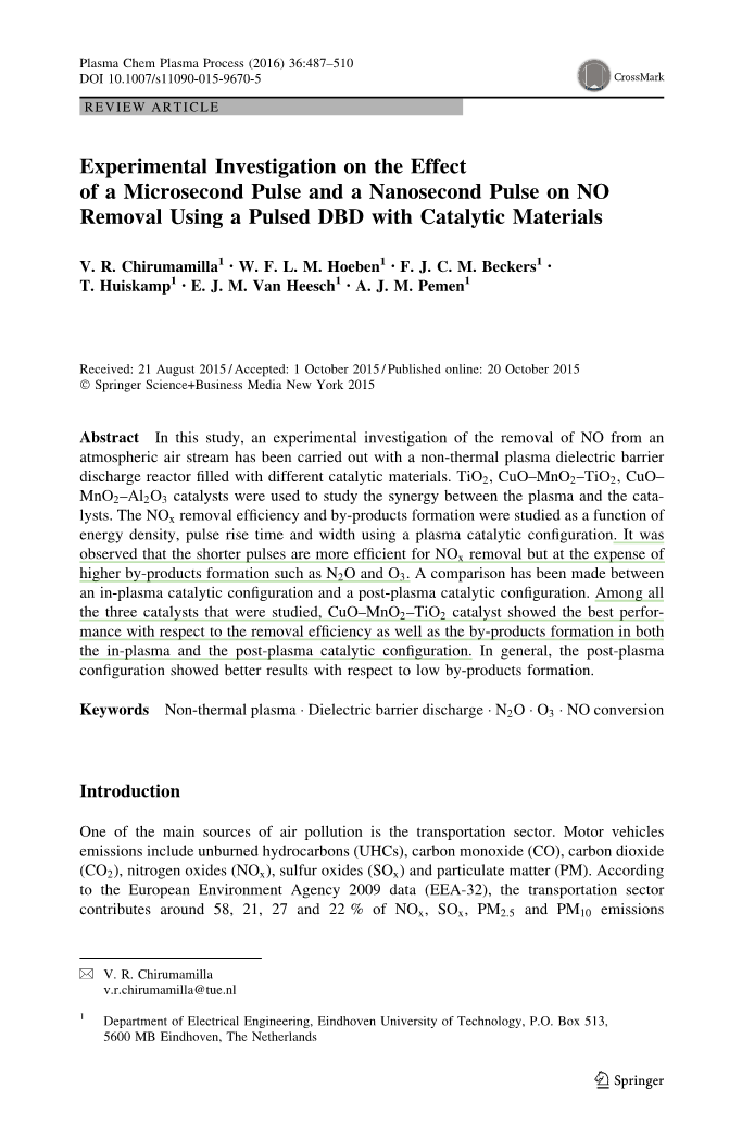 Abstract In this study, an experimental investigation of the removal of NO from an atmospheric air stream has been carried out with a non-thermal plasma dielectric barrier discharge reactor filled with different catalytic materials. TiO2, CuO–MnO2–TiO2, CuO– MnO2–Al2O3 catalysts were used to study the synergy between the plasma and the cata-lysts. The NOx removal efficiency and by-products formation were studied as a function of energy density, pulse rise time and width using a plasma catalytic configuration. It was observed that the shorter pulses are more efficient for NOx removal but at the expense of higher by-products formation such as N2O and O3. A comparison has been made between an in-plasma catalytic configuration and a post-plasma catalytic configuration. Among all the three catalysts that were studied, CuO–MnO2–TiO2 catalyst showed the best perfor-mance with respect to the removal efficiency as well as the by-products formation in both the in-plasma and the post-plasma catalytic configuration. In general, the post-plasma configuration showed better results with respect to low by-products formation.