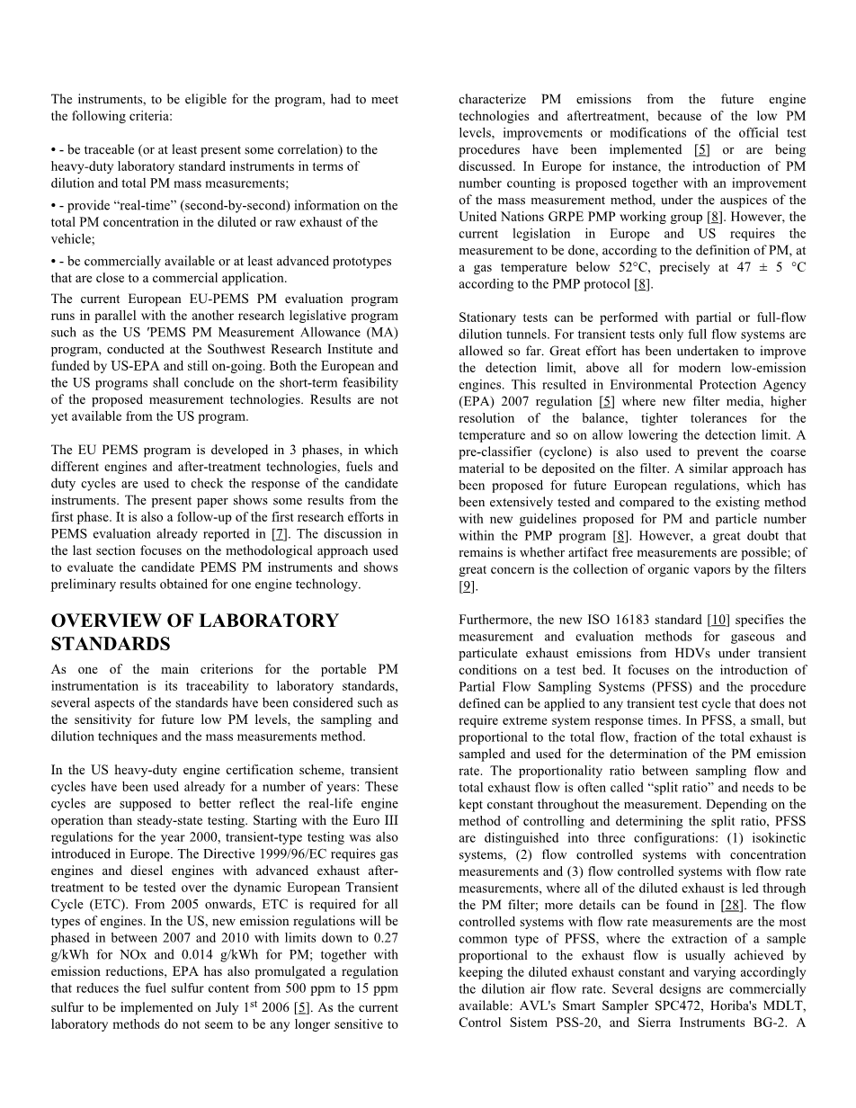目前的欧洲EU-PEMS PM评估项目与美国PEMS PM测量津贴计划(MA)项目并行运行,该项目在西南研究所进行而且由美国环保署资助,目前此项目仍在继续研究中。欧洲和美国的项目都应就拟议的测量技术在短期内的可行性作出结论,但从美国的研究项目中尚未得到结果。欧盟PEMS项目分为三个阶段,分别使用不同的发动机和后处理技术、燃料和工作循环来检验候选仪器的响应。本文给出了第一阶段的一些结果。它也是在PEMS评估中已经报告的第一个研究努力的后续工作[7]。最后一节的论述集中讨论了用于评估PEMS PM仪器的方法,并展示了其中一种发动机技术所获得的初步结果。