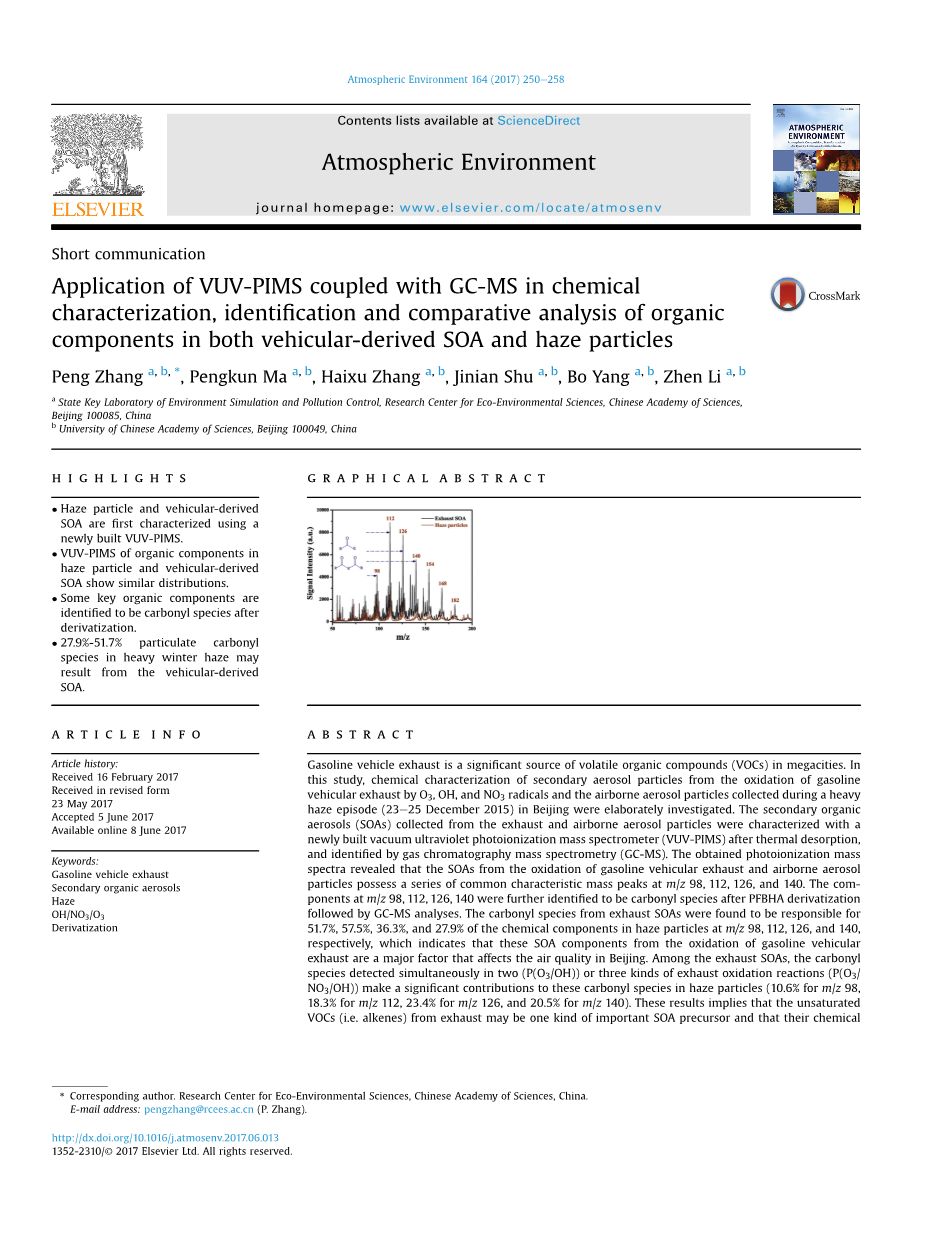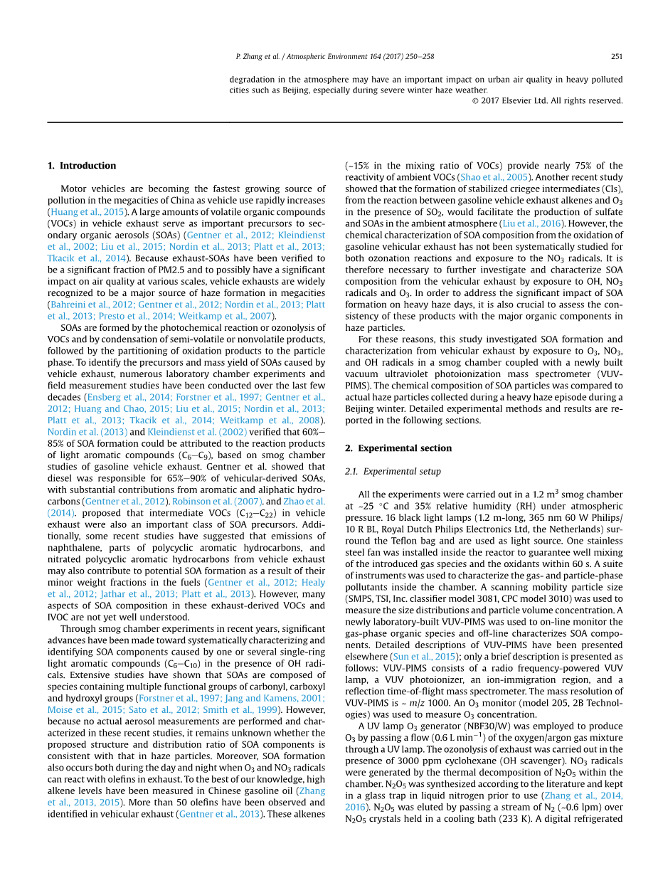 VUV-PIMS与GC-MS联用在化学表征中的应用 汽车排气SOA和雾霾粒子中有机组分的鉴定和比较分析外文翻译资料