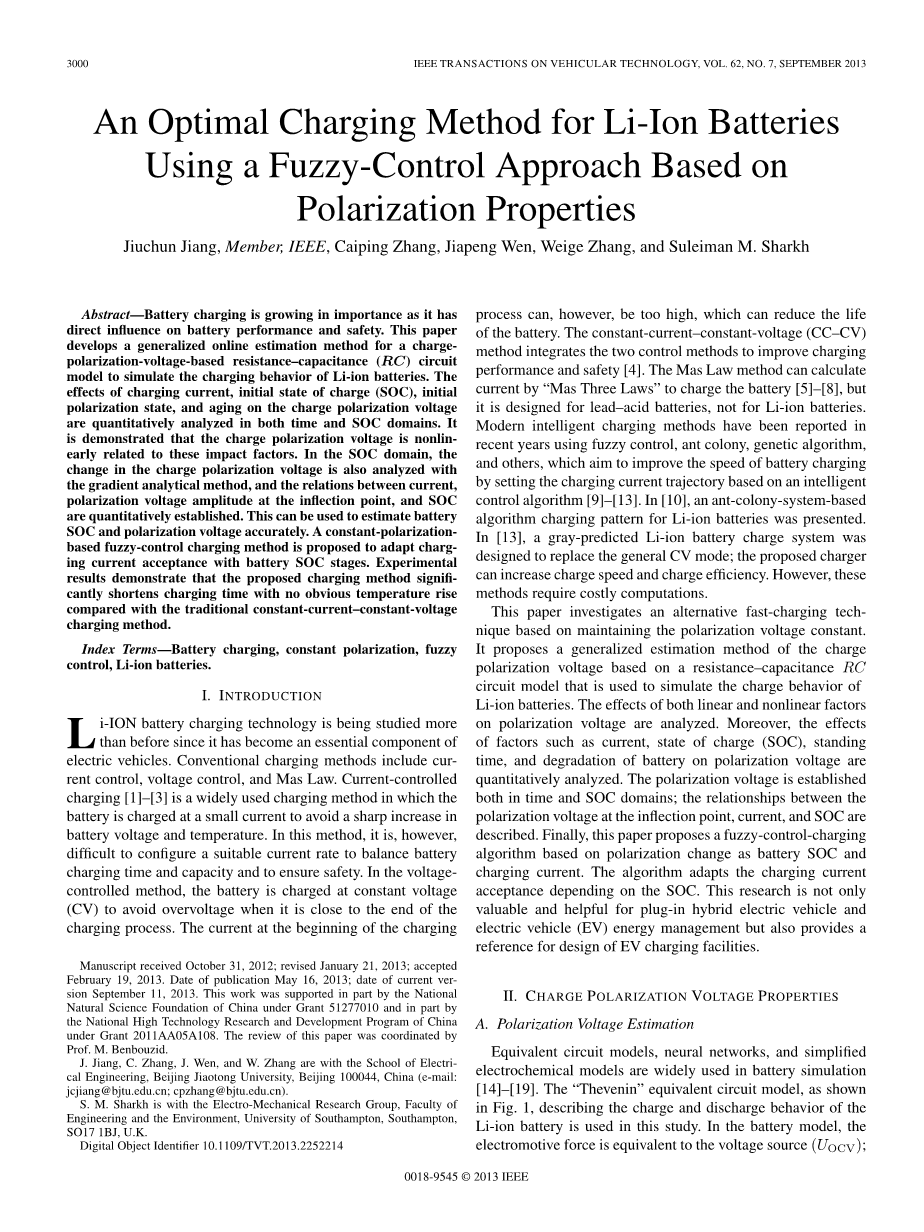 电池充电变得越来越重要,因为它直接影响电池的性能和安全。本文开发一个通用的在线估计方法-基于阻容(RC)电路模型的充电极化电压来模拟锂离子电池的充电行为。充电电流的影响,初始状态(SOC),初始偏振状态和老化电荷极化电压在时间和SOC领域被广泛定量分析,这也证明了电荷极化电压非线性与这些影响因素有关。在SOC域中,电荷极化电压的变化也用梯度分析方法进行了分析,同时电流,极化电压振幅的拐点和电容状态之间的联系也被基本确定。这可以准确地用来估计电池SOC和极化电压。为了适应电池不同的电容状态阶段,专家提出了一个基于模糊控制的固定极化充电方法。实验结果表明,与传统的恒流-恒压充电方法相比,上述的充电方法在电池温度没有明显升高的前提下显著地减短了充电时间。