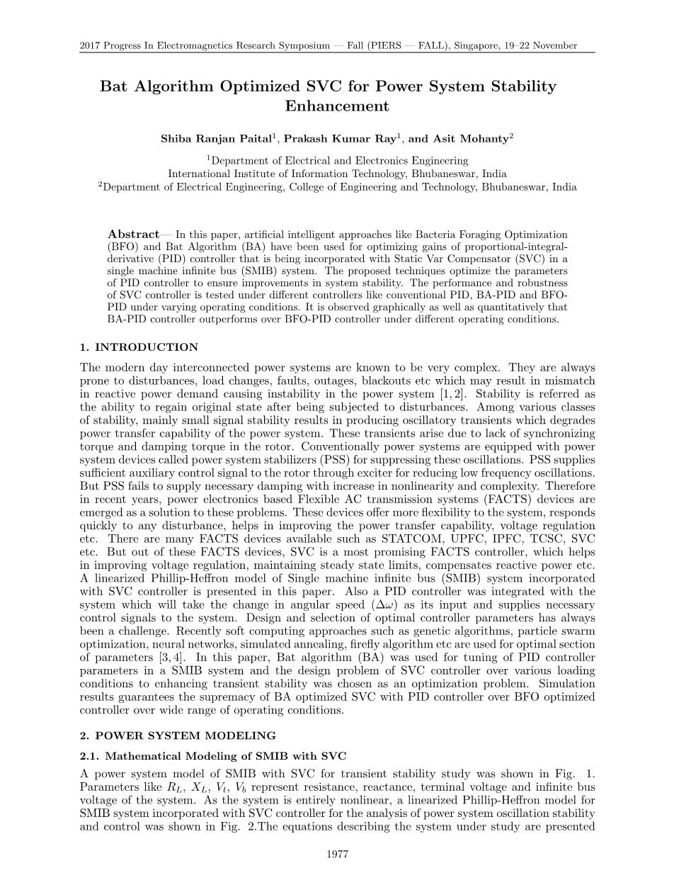 但是,在这些设备中,SVC是最有前途的FACTS控制器,这有助于改善电压调节、维持稳态极限、补偿无功功率等方面。单机无穷大(SMIB)系统的线性化Phillip-Heffron模型介绍了SVC控制器,还将PID控制器与角速度的变化(Delta;omega;)作为输入并提供必要的系统控制信号,最优控制器参数的设计与选择是一个挑战。用最近的软计算方法,如遗传算法、粒子群优化、神经网络、模拟退火、萤火虫算法等方法进行优化计算。
