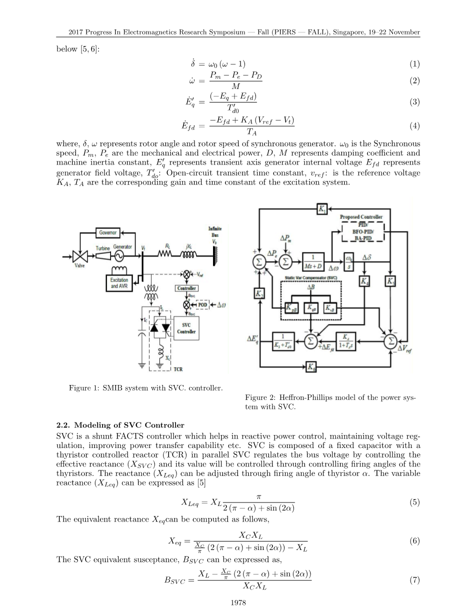 SVC是一种并联的事实控制器,它有助于无功控制,维持电压调节,提高电力传输能力等。SVC是由一个固定的电容器组成的,它有一个并联的晶闸管控制反应器(TCR)通过控制有效电抗(XSVC)及其值将通过控制晶闸管,电抗(Xleq)可通过晶闸管alpha;的点火角度进行调节,变量导纳(Xleq)可以表示为(5)