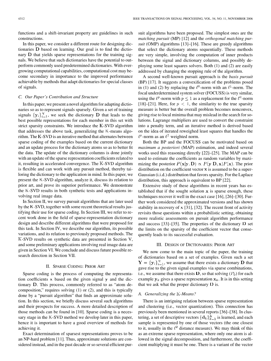 在第二节中,我们调查了K-SVD后来使用的追踪算法,以及一些最近的理论结果证明了它们用于稀疏编码。