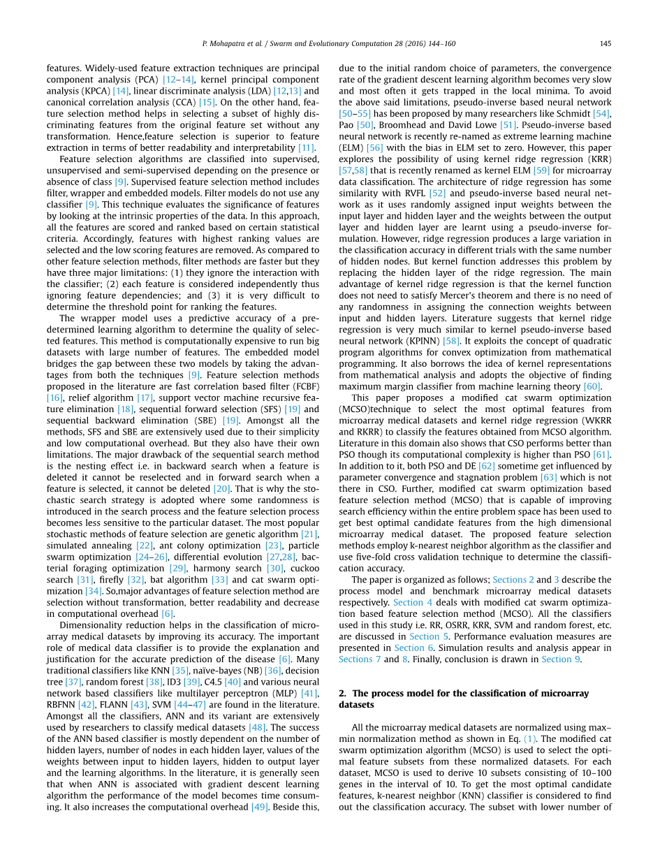 本文提出了一种改进的猫群算法(MCSO)技术,从微阵列医学数据集和核岭回归(WKRR和RKRR)中选择最优的特征,对从MCSO算法获得的特征进行分类。这一领域的文献也表明CSO的性能比PSO好,尽管它的计算复杂度高于PSO[61]。