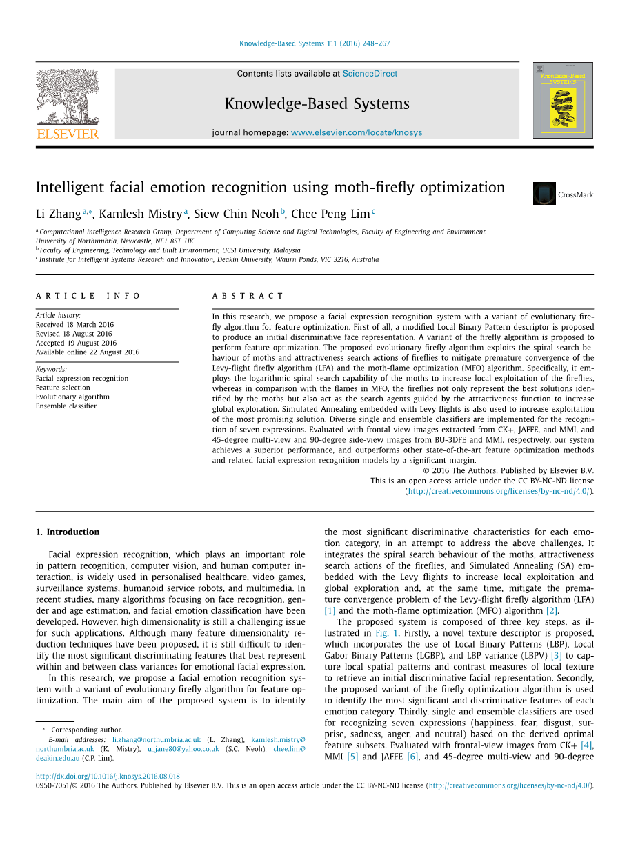 Siddiqi等人[11]提出了应用逐步线性判别分析(SWLDA)用于特征提取和隐藏的条件随机场(HCRF)模型进行表达识别的一个面部表情识别系统。在他们的工作中,面部表情分为三类,即以嘴唇为基础的,以嘴唇和眼睛为基础的,和以嘴唇,眼睛,额头为基础。第一步是使用SWLDA和HCRF将输入图像分类为三种类别之一。其次,SWLDA和HCRF仅为特定训练而训练类别被用来确定情绪标签。利用CK ,JAFFE,MMI和扩展耶鲁B人脸数据集进行评估,该成果在识别准确度方面有了显着改善,但是计算成本昂贵。 Neoh等人[12]提出一个具有直接相似性和基于Pareto功能优化的面部表情系统。前者与这一概念微型遗传算法来识别可能代表的特征子集每个表达的共同特征相结合。后者采取了内部以及考虑到多目标特征的类别变化进行优化。与多种整体分类器相结合,在进行CK 和MMI测试时,这项工作取得了骄人的成绩。基于帕雷托的方法也被证明是更有效地处理具有挑战性的正面和侧面图像功能优化。 Zhang等人[13]进行实时3D面部动作单元(AU)强度估计和表达承认。他们的工作采用了最小冗余最大相关性(mRMR)标准在最初提取的原始面部特征中的子集来识别一组16个特征,然后用于估计16个诊断性AU的强度。一种新型的与聚类算法相结合的集成分类器用于六种通用面部表情的分类和检测新来的,看不见的新颖情感类(那些不是包括在训练数据集中)。在他们的工作中在每个集合内被用于新的类别检测,以距离为基础聚类方法和基分类器的不确定性度量。使用博斯普鲁斯海峡三维数据库和真实人体评估,该系统对六种情感和新奇的看不见的表情的识别性能令人印象深刻。