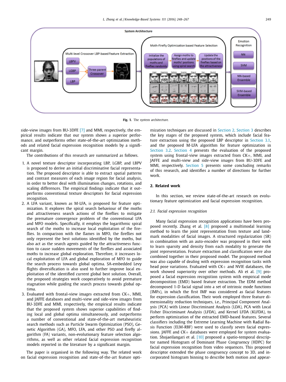 所提出的系统由三个关键步骤组成,如图1所示。首先,提出了一种新颖的纹理描述符,它结合了本地二进制模式(LBP)Gabor二进制模式(LGBP)和LBP方差(LBPV)[3]的使用来捕获局部空间模式和局部纹理的对比度测量检索初始的区别性面部表示。其次,使用了萤火虫优化算法的拟议变体以确定每个的最重要和有差别的特征情感类别。第三,基于派生的最优功能子集使用单个和整体分类器。承认七种表达(幸福,恐惧,厌恶,惊奇,悲伤,愤怒和中立)。使用CK [4],MMI[5]和JAFFE[6]的正面图像以及来自BU-3DFE[7]和MMI的45度多视角和90度侧视图像进行评估,经验结果表明我们的系统显示出优越的性能,优于其他最先进的优化方法和相关的面部表情识别模型。